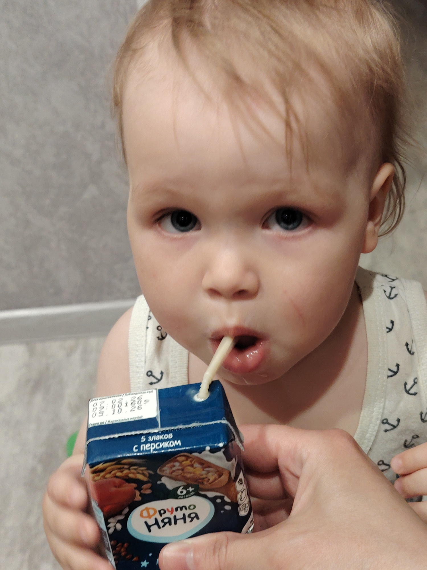 A toddler is drinking from a juice box using a straw. The box is blue and has a picture of fruit and the words "Фруто Няня" written on it. The juice box is being held by an adult hand. The toddler is…read more