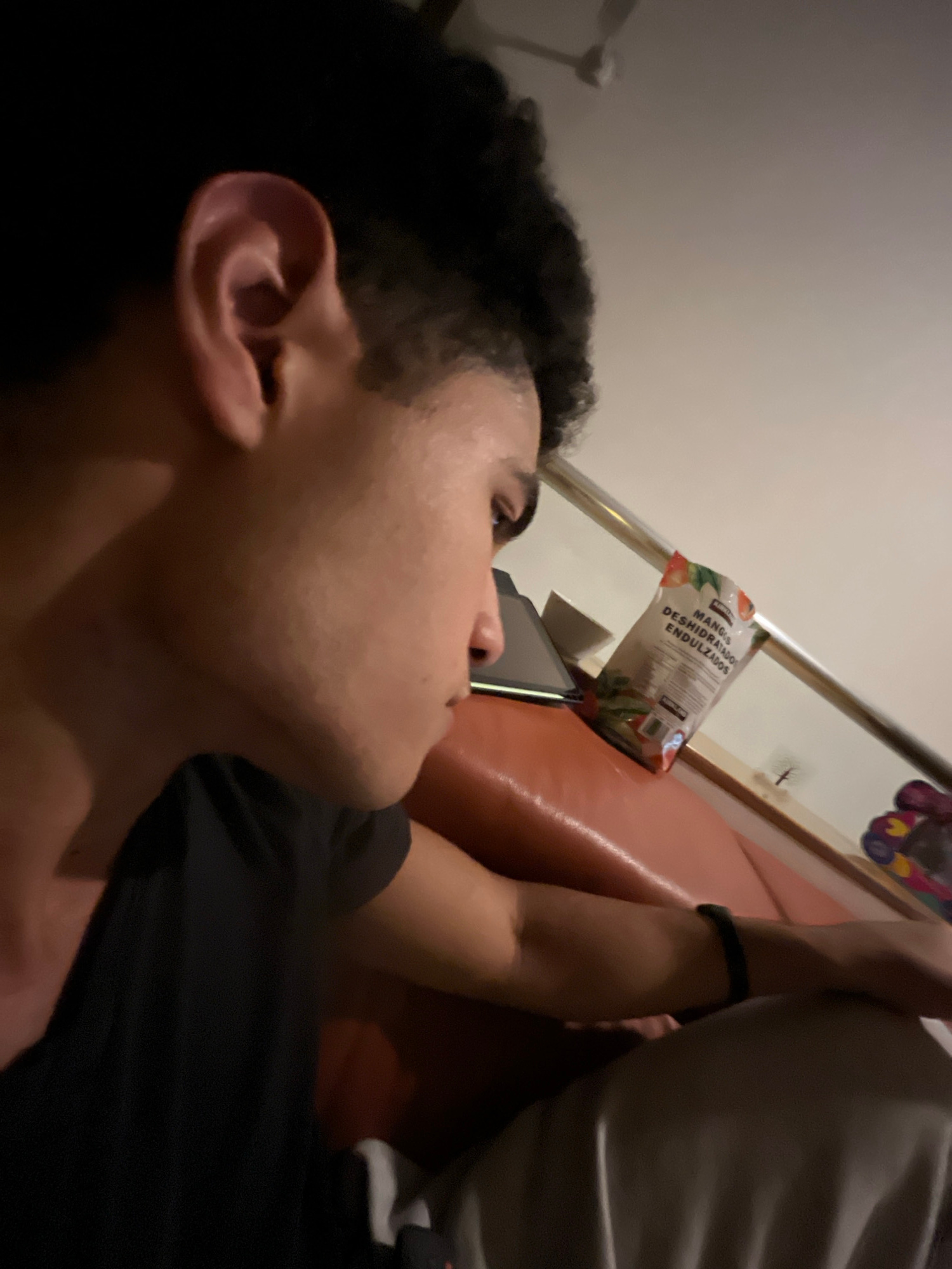 A young man is lying on an orange couch, facing away from the camera. He is wearing a black t-shirt and has dark curly hair. His right arm is visible and has a black fitness tracker on the wrist. A ba…read more