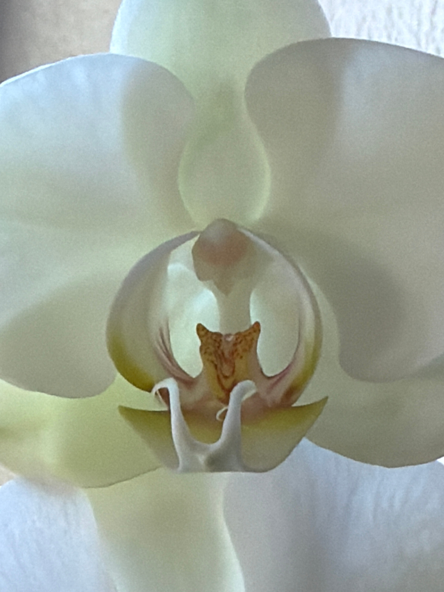 The image shows a close-up of a white orchid flower. The central part of the flower, including the labellum, is visible with yellow and brown markings. The petals appear translucent and slightly blurr…read more