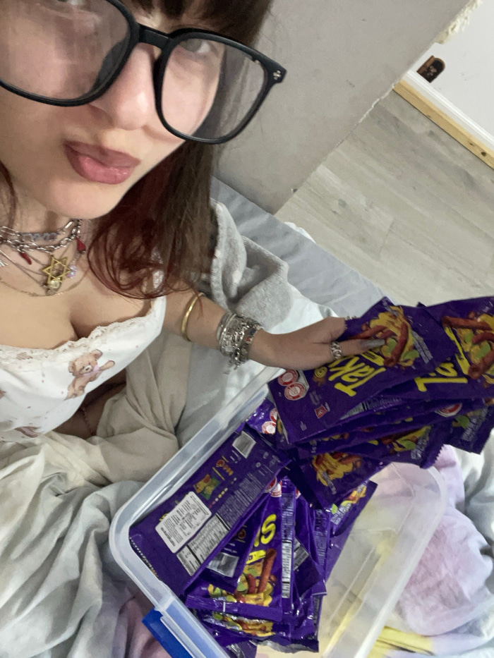 A person wearing large black-rimmed glasses is visible in a selfie. They have multiple bracelets and rings, and several necklaces, including one with a Star of David. They're holding several bags of T…read more