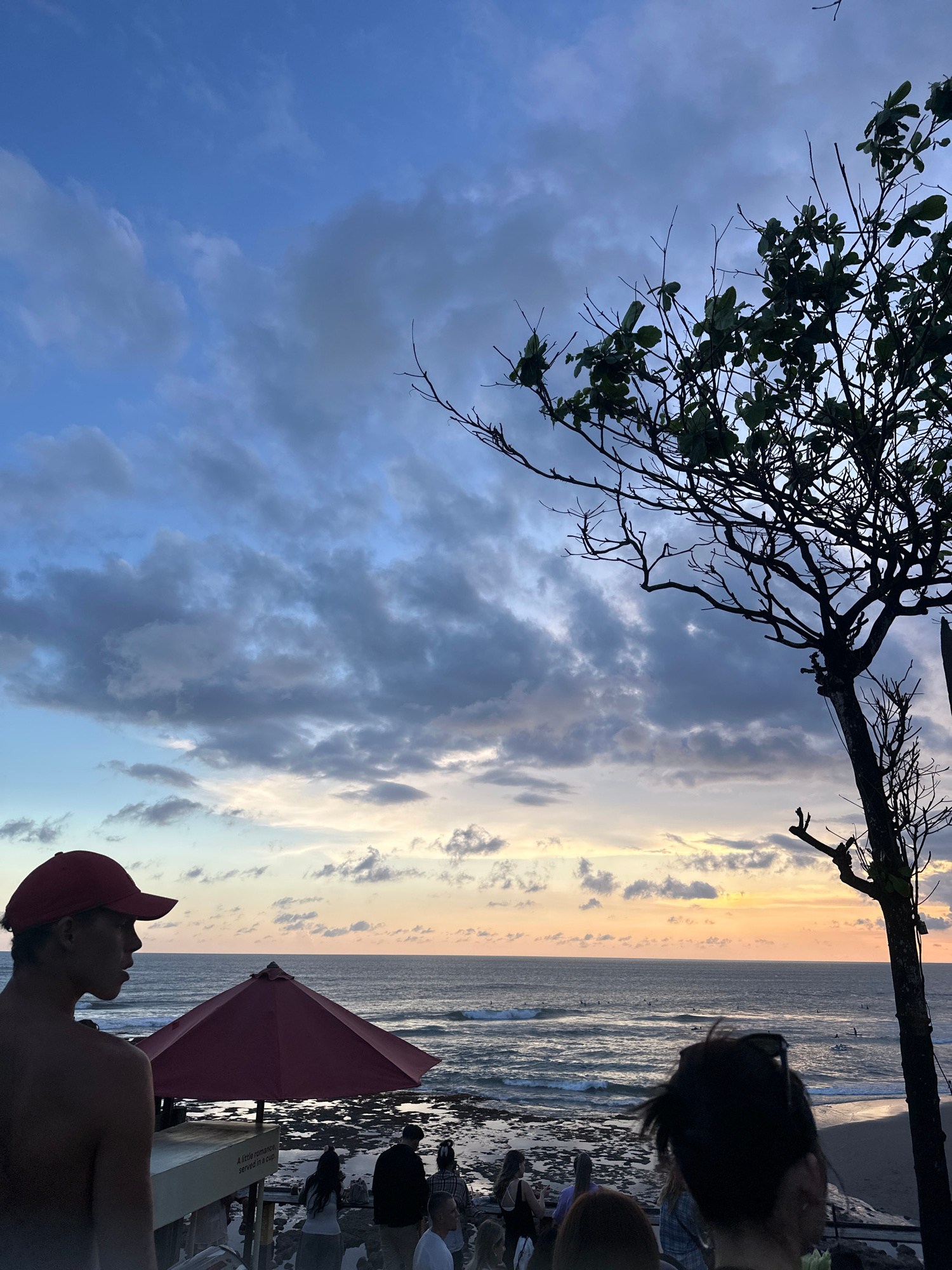 The photograph captures a beach scene in Canggu, Indonesia. It's twilight, with a sky ranging from pale blue to orange over the sea. Overhanging the scene are the branches and leaves of a tree. A crow…read more