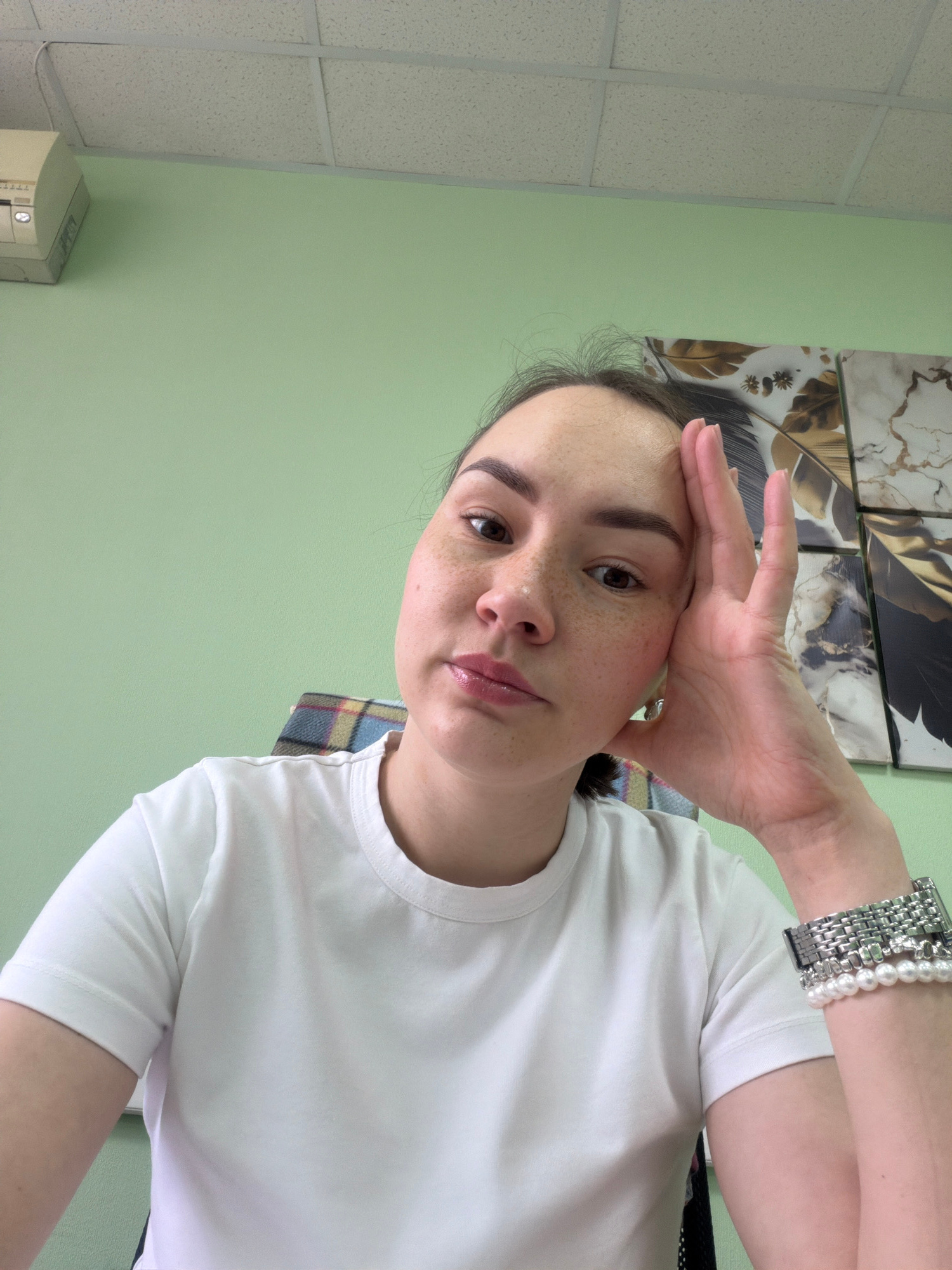 A person with light skin, brown hair, and freckles is posing for a selfie. They are wearing a white t-shirt and a bracelet with silver and pearl elements on their left wrist. Their left hand is raisedβ¦read more