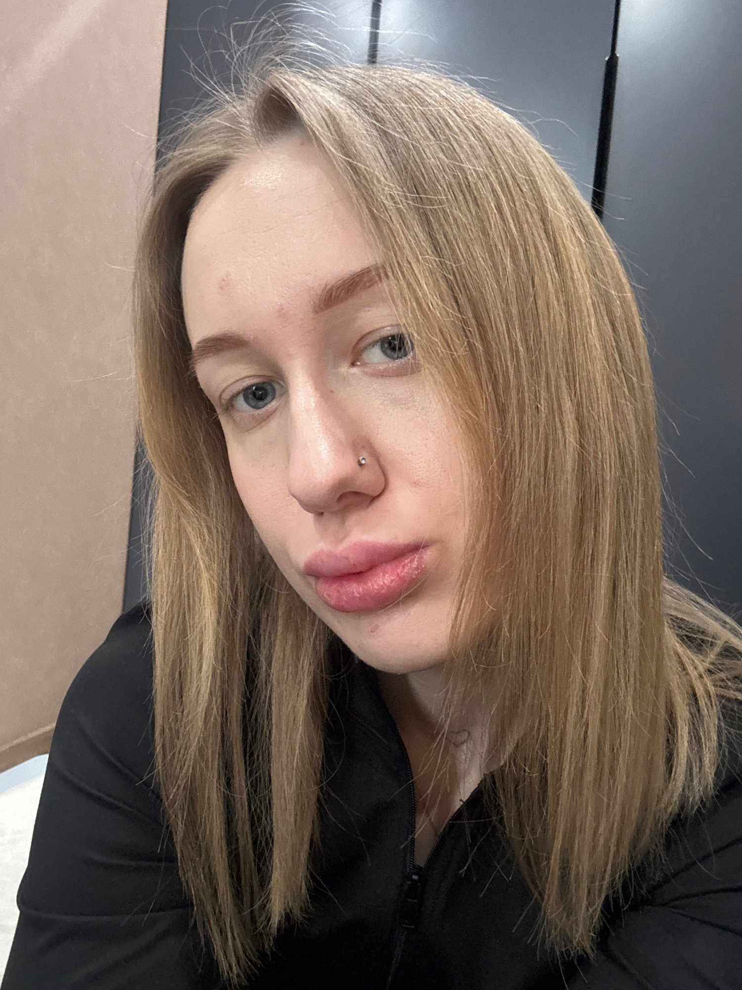 The image is a close-up selfie of a young woman with light blonde hair. She has fair skin, blue eyes, and a nose piercing. She is wearing a black top. There is a dark gray surface in the background, a…read more