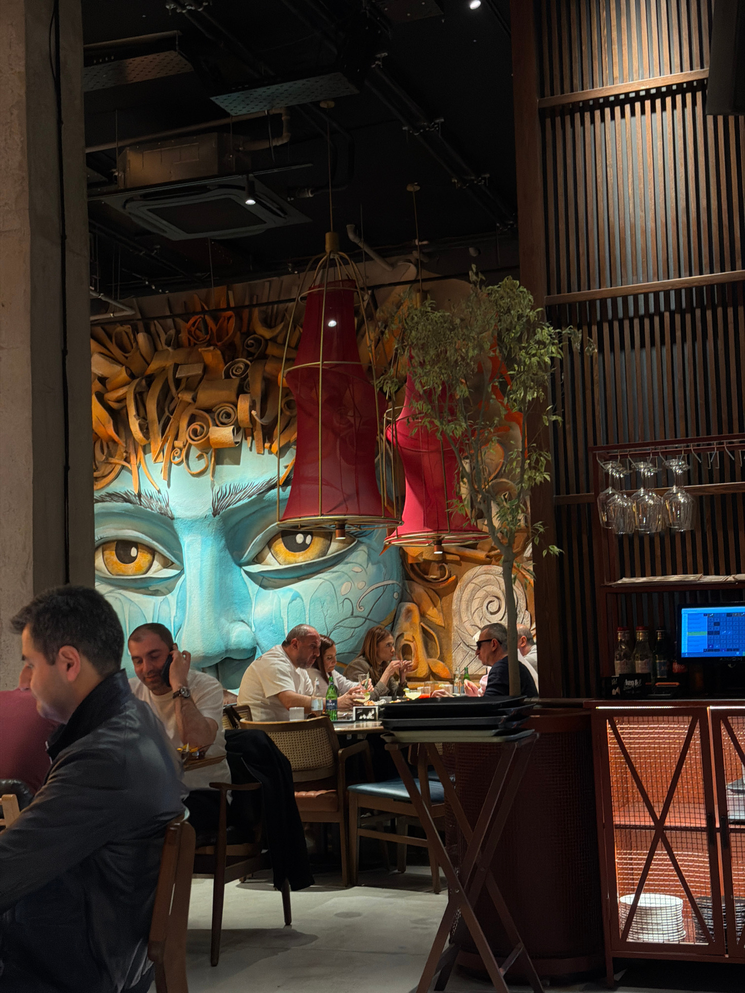 The image shows an interior scene in what appears to be a restaurant or bar in Yerevan, Armenia. A mural of a large blue face with prominent eyes dominates the wall. A decorative hot air balloon repli…read more