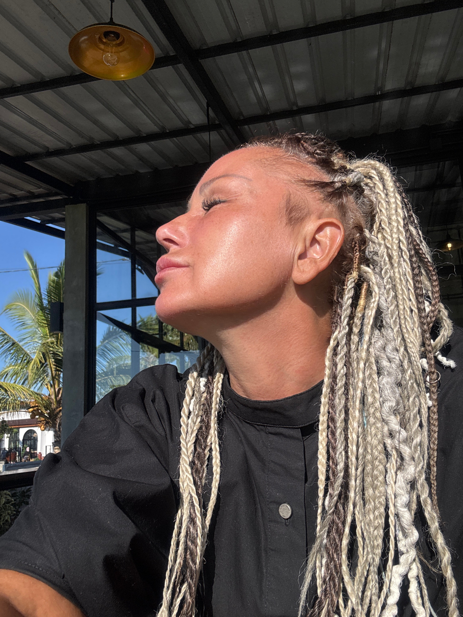 A woman is sitting in a shaded area, likely a cafe or restaurant, in Tampaksiring, Indonesia. Her face is in profile; she has light skin and braided hair in shades of blonde and brown. She wears a bla…read more