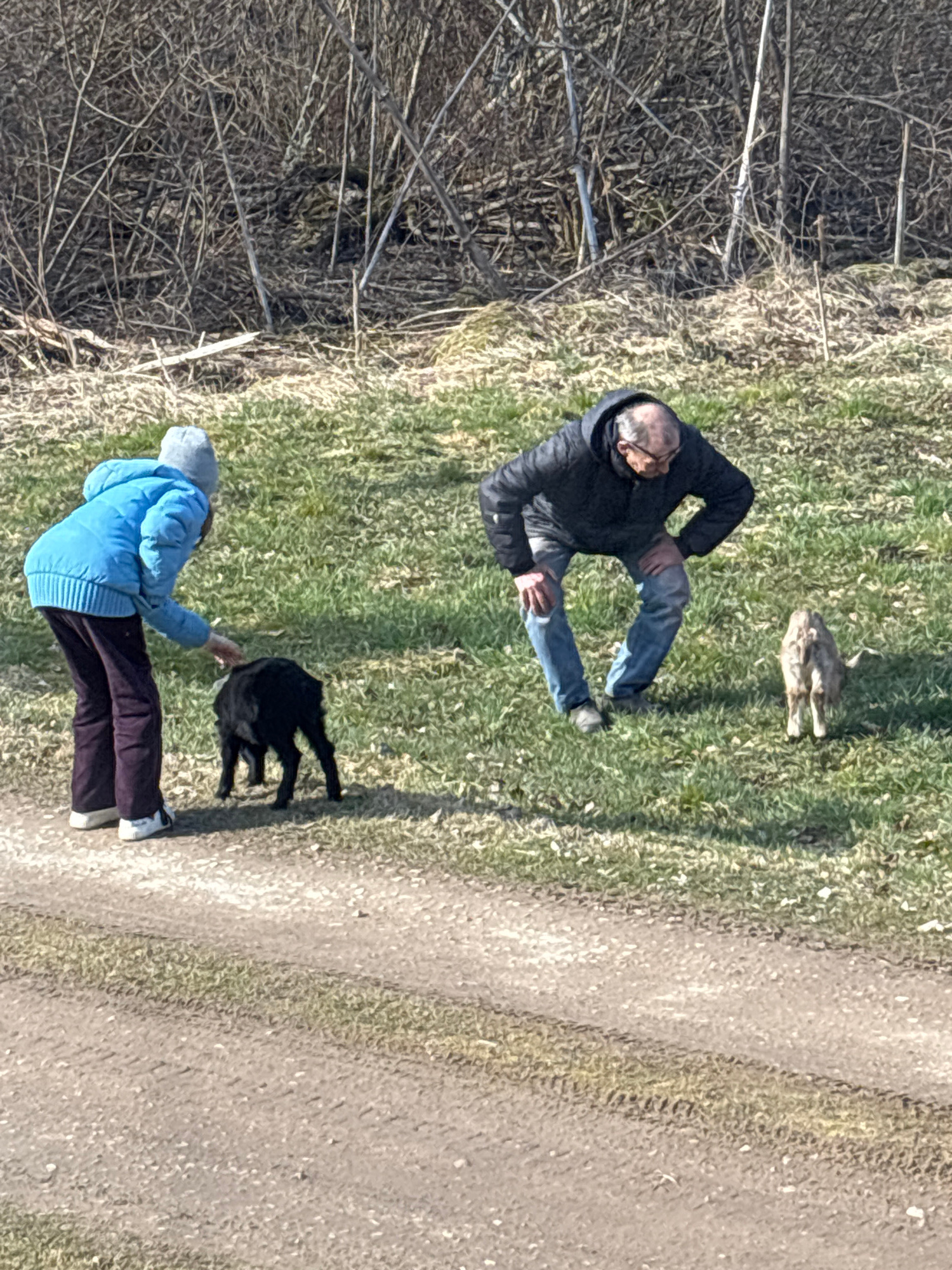 The image, seemingly taken from an elevated position, shows a scene next to a path or road in what appears to be a grassy area. The environment includes a patch of dry vegetation to the left. Two indi…read more