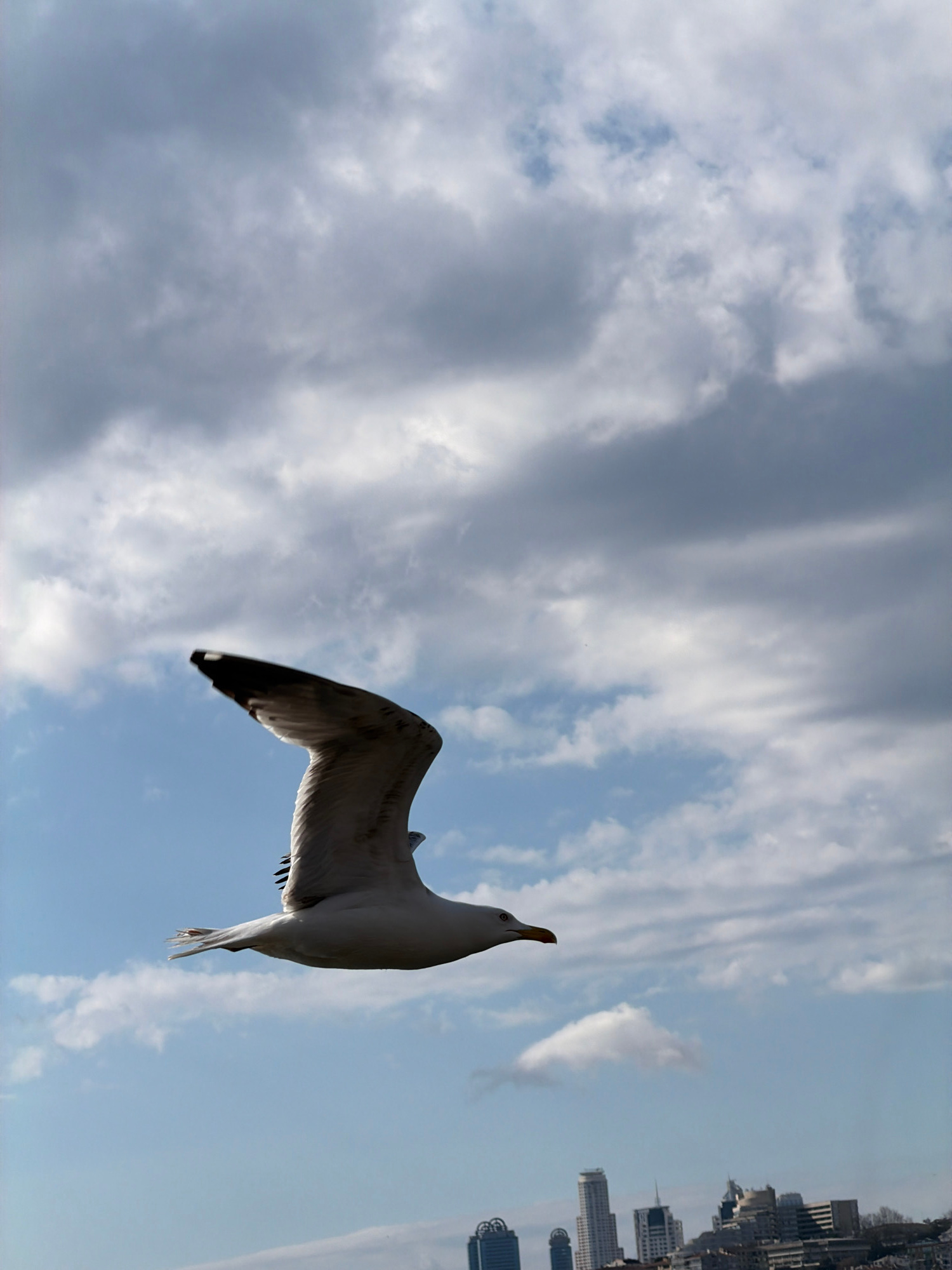 The image depicts a seagull in flight against a sky with varying cloud cover. In the distance, the skyline of Üsküdar, Turkey, is visible. The seagull is primarily white with dark wingtips and is posi…read more