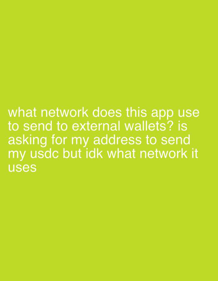 The image contains text overlayed on a solid light green background. The text asks a question: "what network does this app use to send to external wallets? is asking for my address to send my usdc but…read more