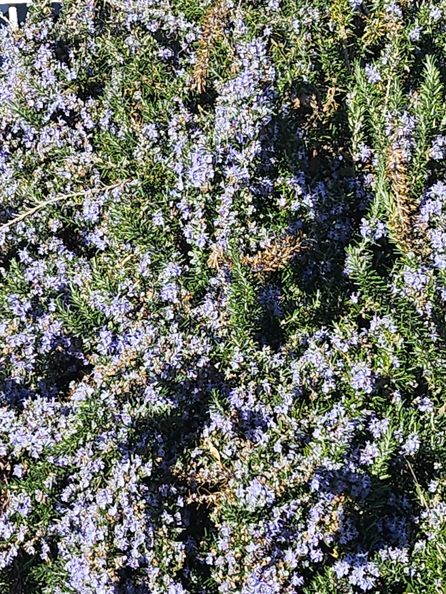 The image shows a close-up view of a rosemary plant in full bloom, with dense green needles and numerous small purple flowers covering the surface. Some areas show dried brown needles. The location, T…read more