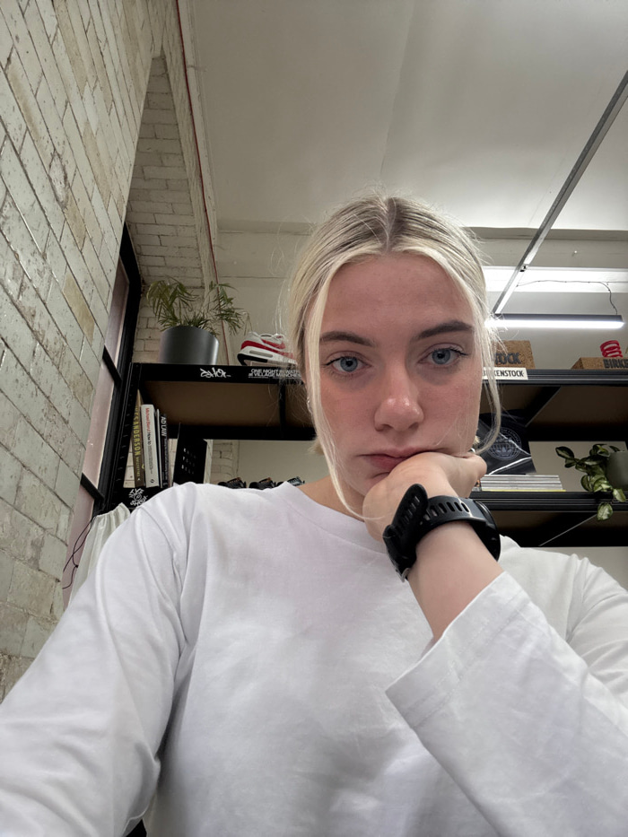 A blonde female, facing the camera directly with a neutral, slightly pensive expression, rests her chin on her left hand. She wears a white long-sleeved t-shirt and a black digital watch on her left w…read more