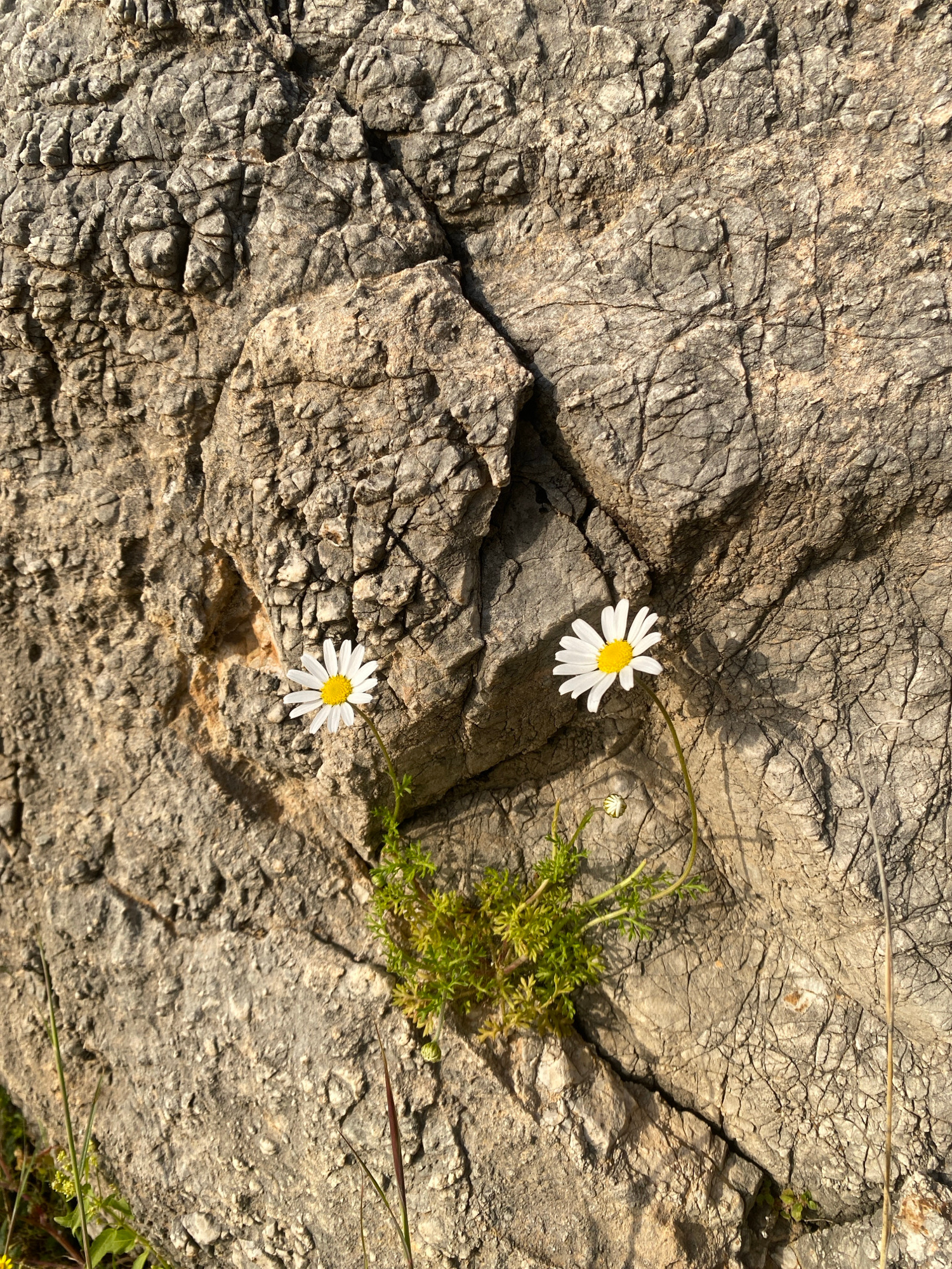 The image shows a close-up view of a rock surface, possibly limestone, with two daisies growing out of a crevice. The rock is light gray with numerous cracks and crevices. There is a small patch of gr…read more