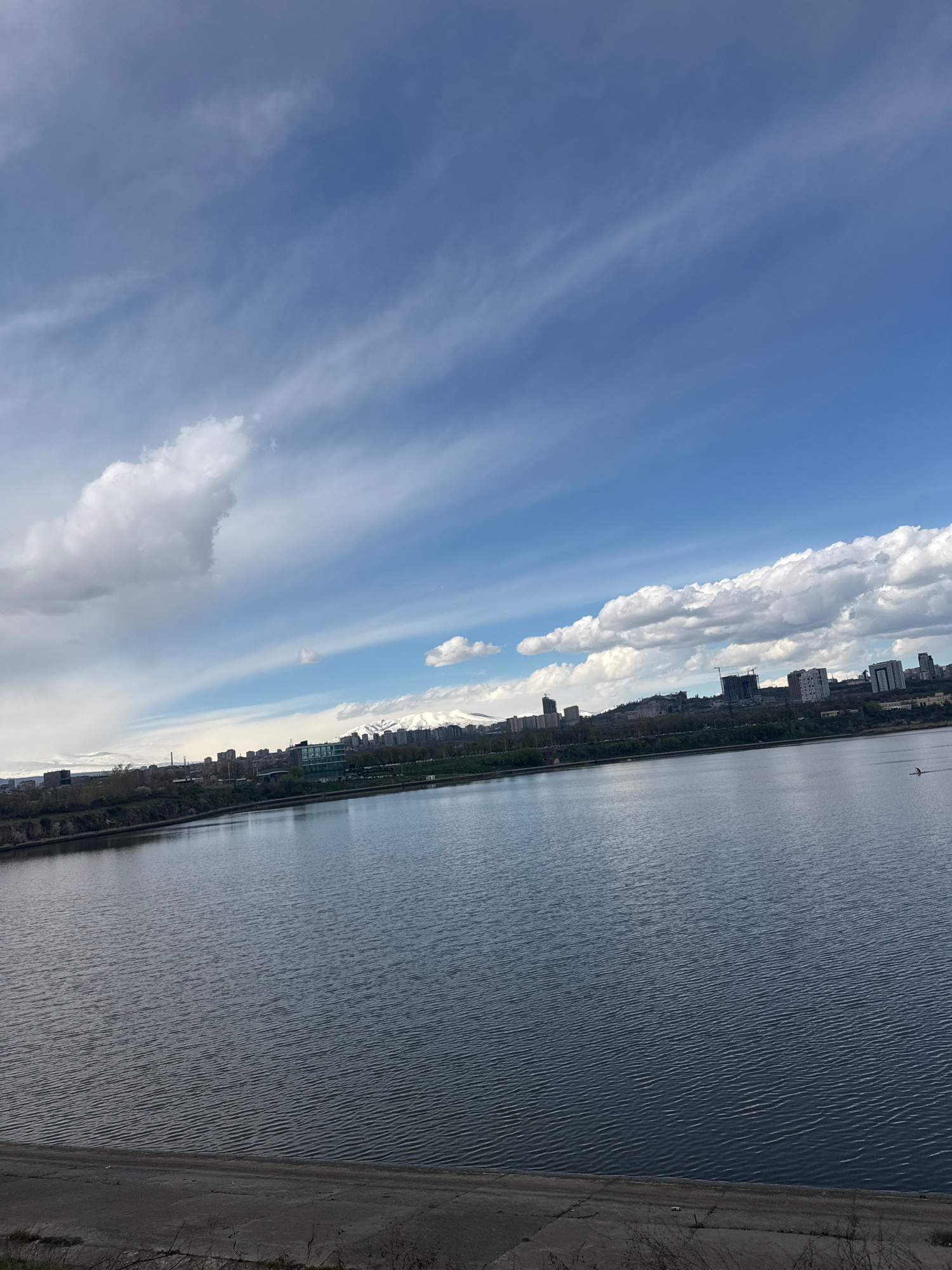The image depicts a cityscape alongside a large body of water, likely a river or lake, under a blue sky with scattered clouds. In the distance, buildings of varying heights can be seen lining the wate…read more