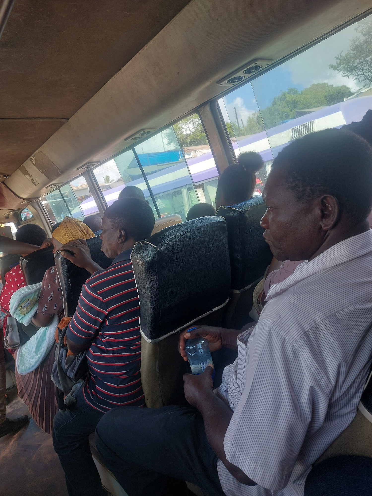 The image captures the interior of a public transport vehicle, likely a bus or minibus, in Dar es-Salaam, Tanzania, during daylight hours under a clear, sunny sky. The perspective is from slightly abo…read more