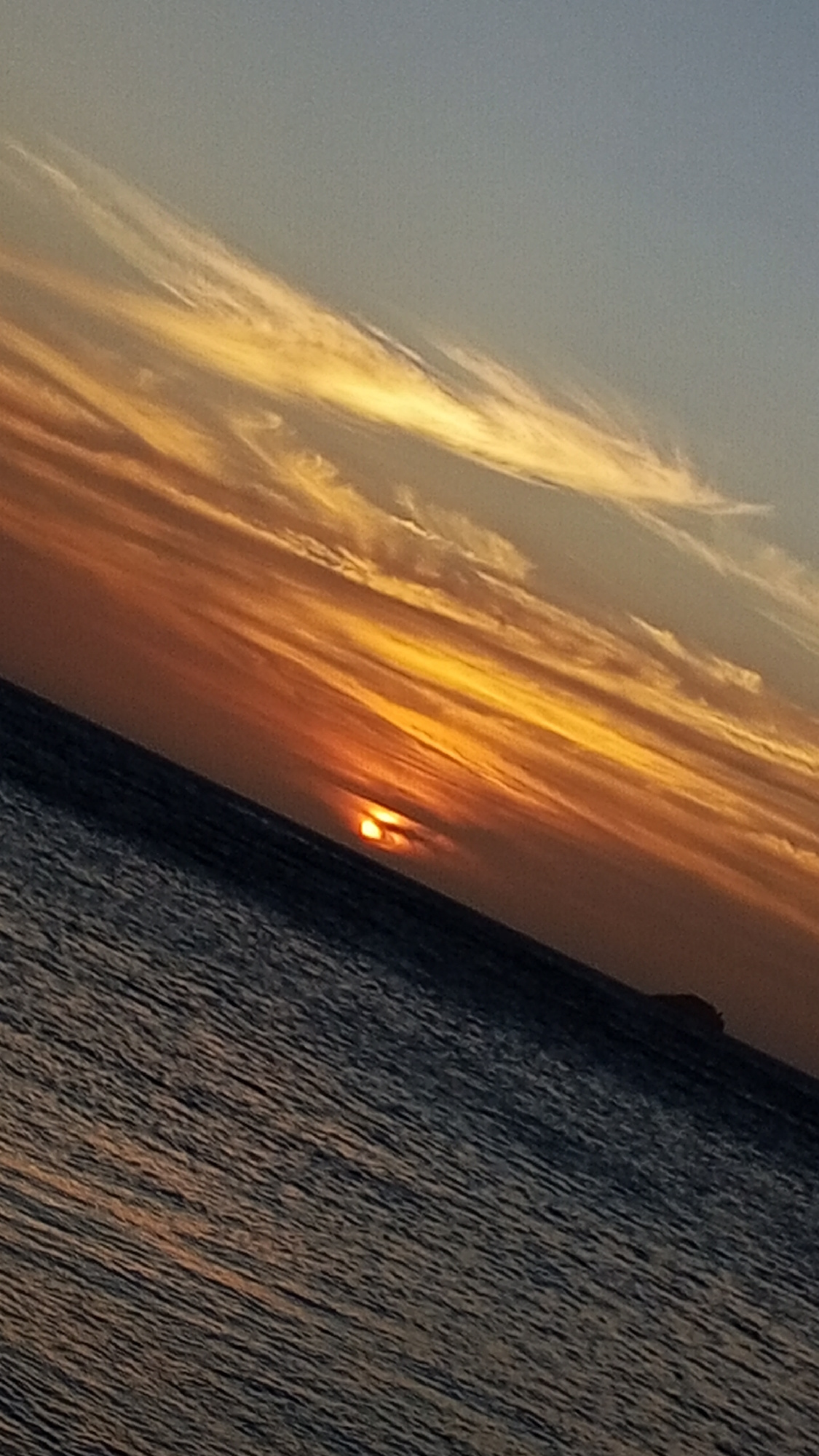 The image shows a sunset over the ocean. The sky is filled with streaks of yellow and orange clouds. The sun is partially obscured by the horizon, creating a warm glow. The water is dark and rippled.…read more
