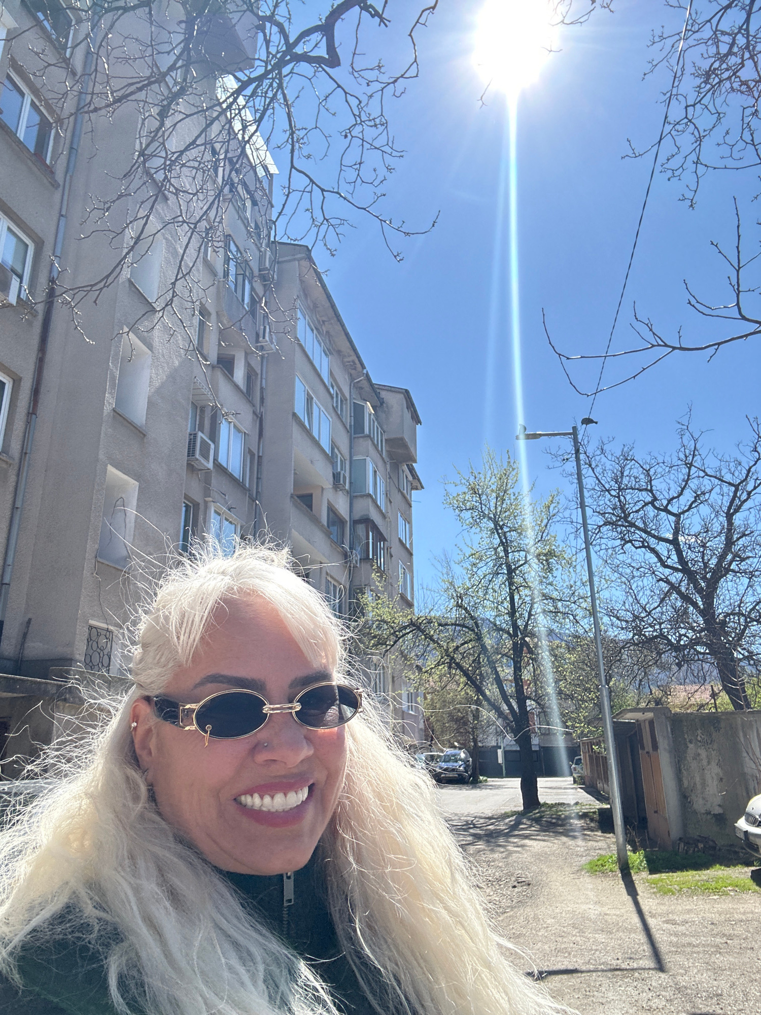 A low-angle, outdoor shot shows a woman with blonde hair and sunglasses. Her head is tilted to the right, and she is smiling, revealing her teeth. Behind her, a multi-story building with many windows…read more