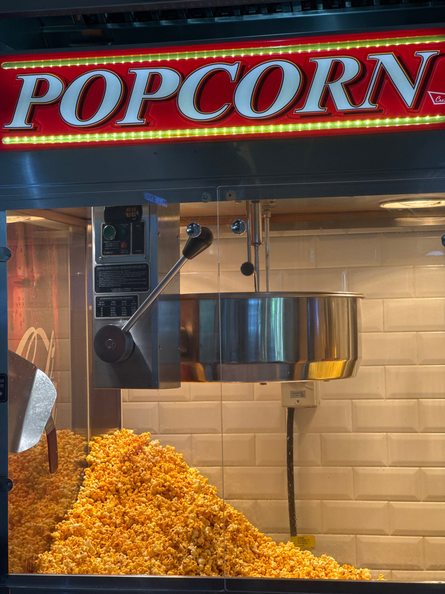 The image displays a close-up of a popcorn machine and its contents, rotated 90 degrees clockwise. The primary subject is a large, vibrant red sign with "POPCORN" written in white, bold letters, illum…read more