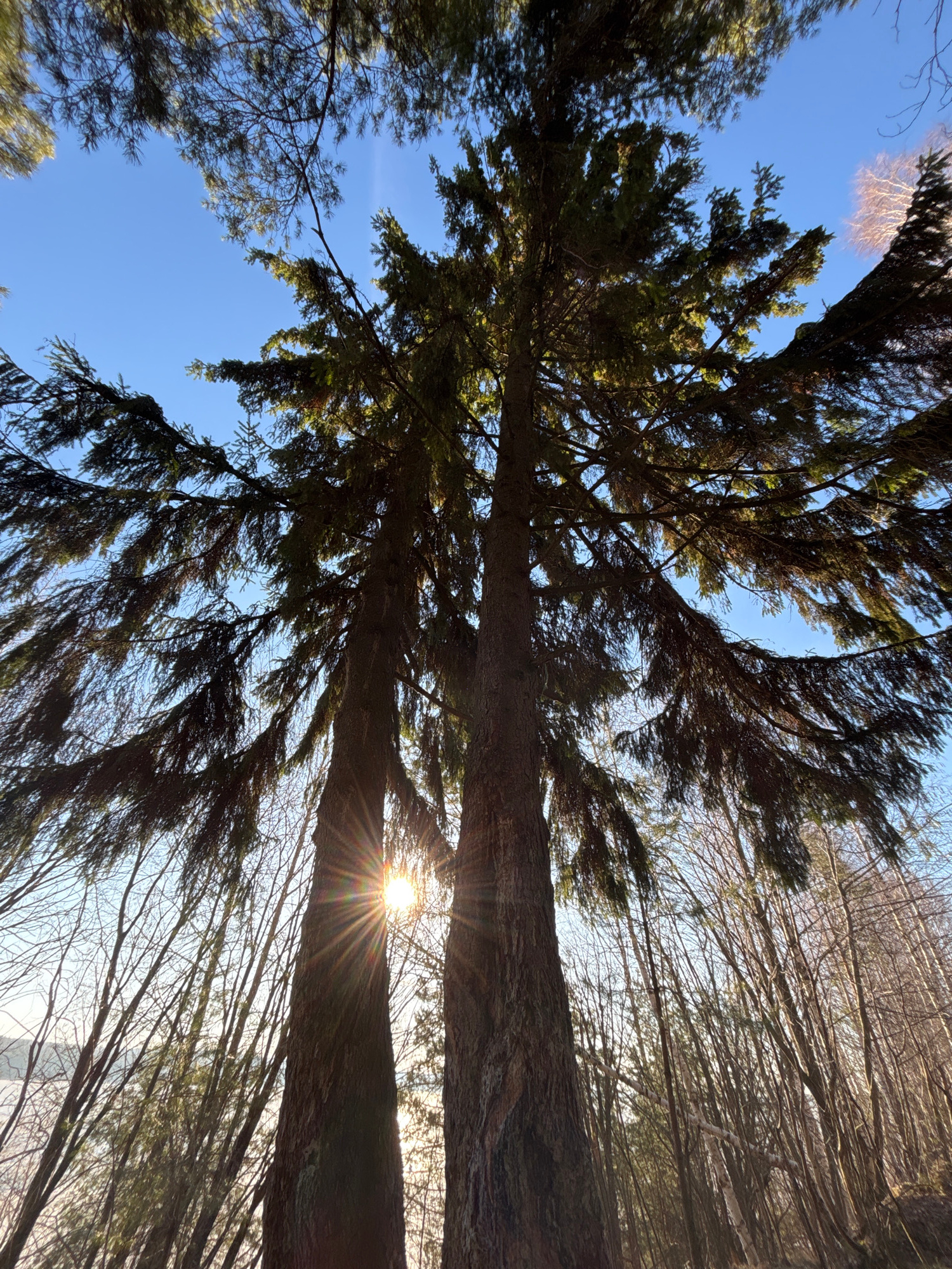 The image is a ground-level shot looking up into a tree canopy against a clear blue sky. The sun is visible through the trees, creating a starburst effect. Some trees have leaves while others are bare…read more