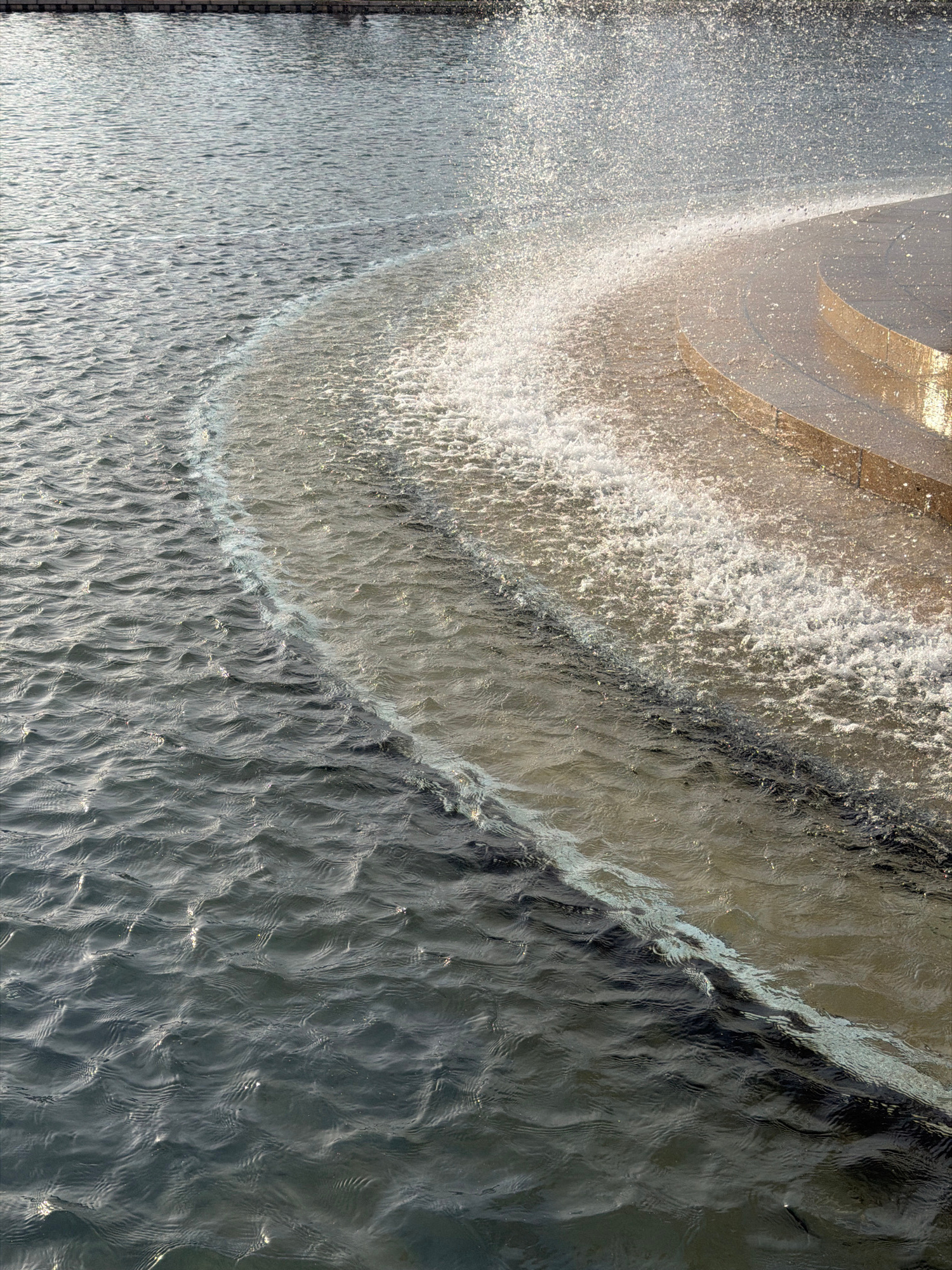 The image is a high-angle shot of a fountain in the city of Krasnodar, Russia. The fountain features a curved, elevated concrete structure from which water cascades down. The falling water creates a c…read more