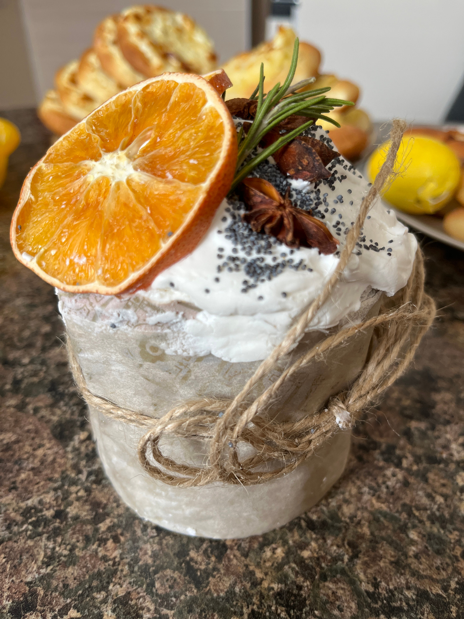 A top-down shot focuses on a cylindrical cheese, decorated and tied with twine. The cheese is covered in a white cream, sprinkled with poppy seeds. Garnish includes a dried orange slice, rosemary spri…read more