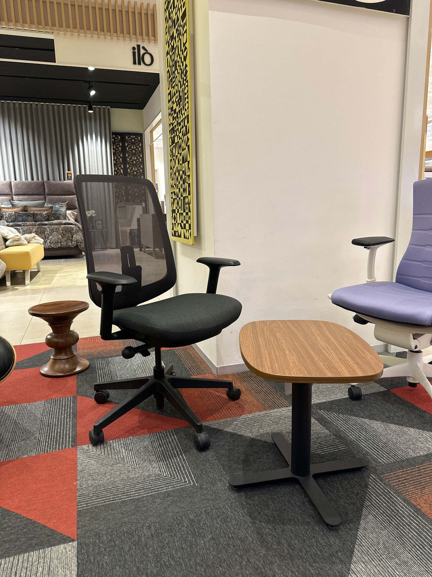 The image shows a display of office furniture inside a building. The furniture includes a purple and white ergonomic chair, a desk, and two black office chairs with mesh backs. The chairs are on a gra…read more