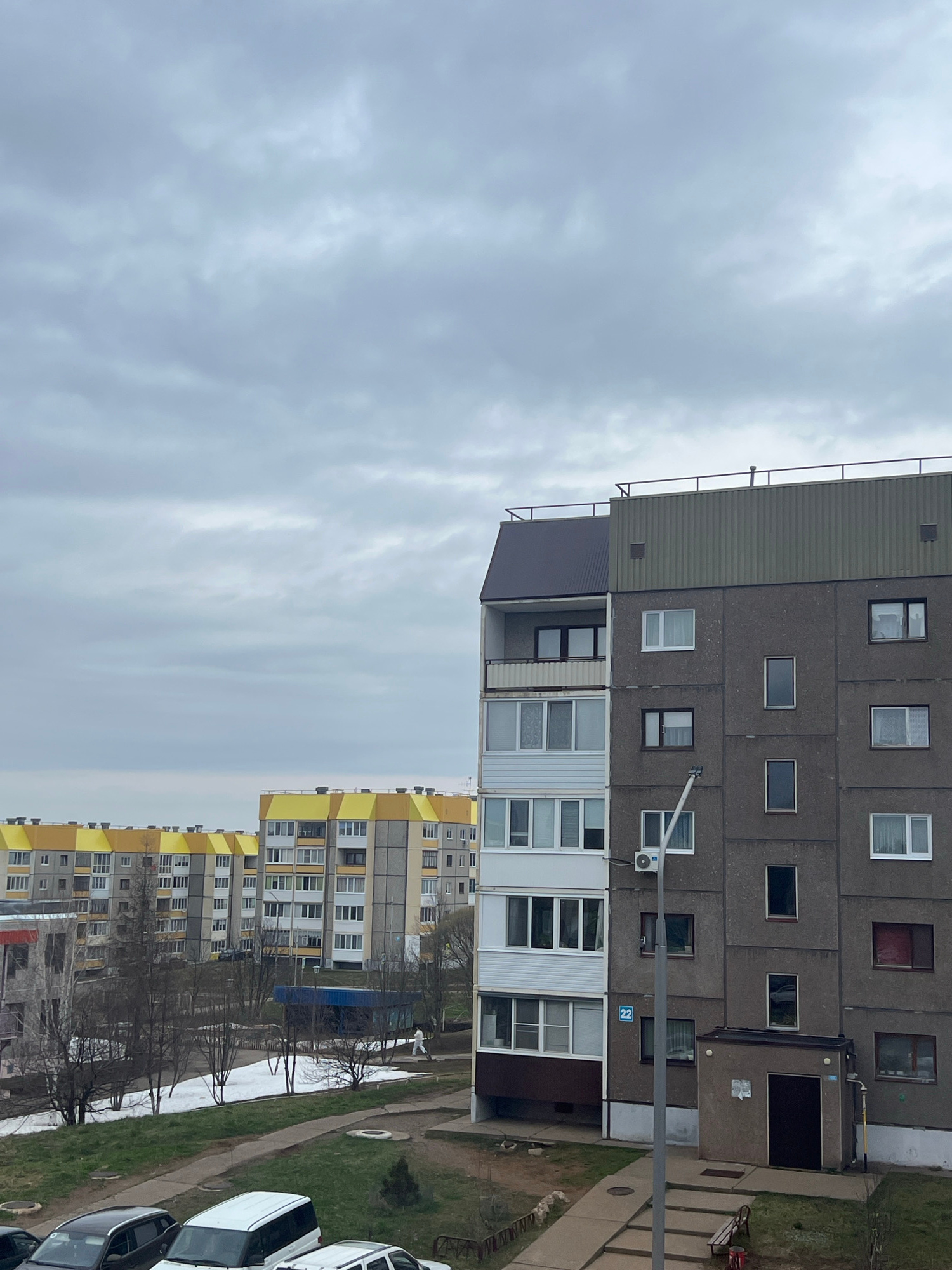 The image shows a view of apartment buildings in Марковский, Russia, under an overcast sky. The foreground features a multi-story concrete building with rectangular windows and balconies. Below, there…read more