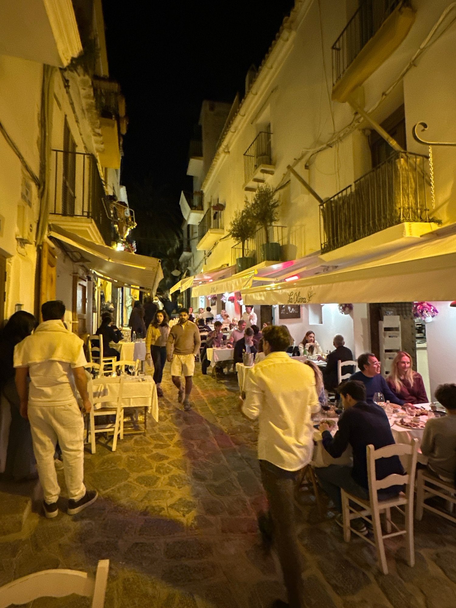 The image captures a vibrant night scene on a narrow street in Ibiza, Spain. The street is lined with white-washed buildings, many with balconies and awnings. Tables and chairs from multiple restauran…read more