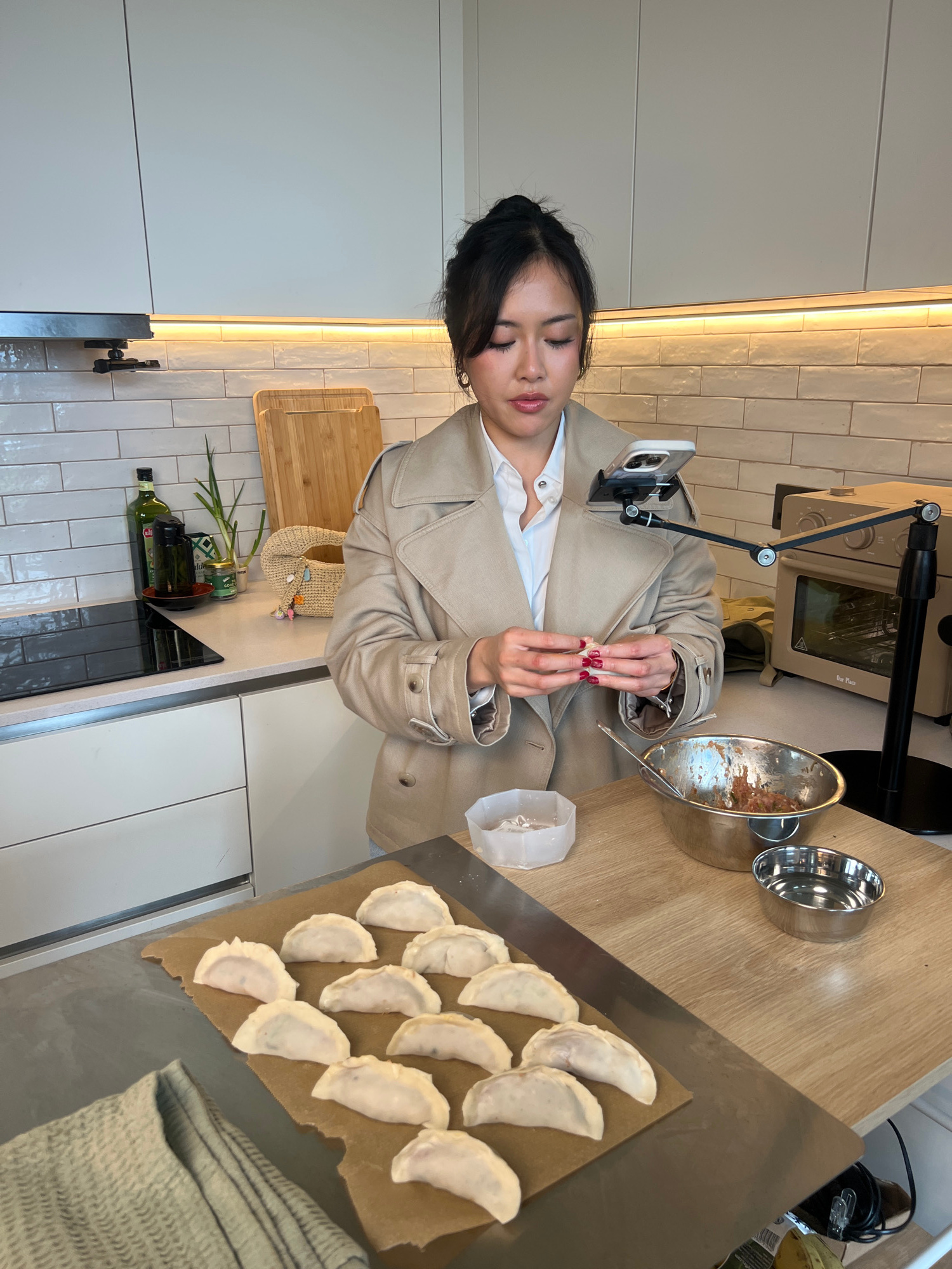 A woman with dark hair is standing in a kitchen. She is wearing a tan trench coat over a white shirt. Her hands are visible, and her fingernails are painted red. She is holding a dumpling. To her righ…read more