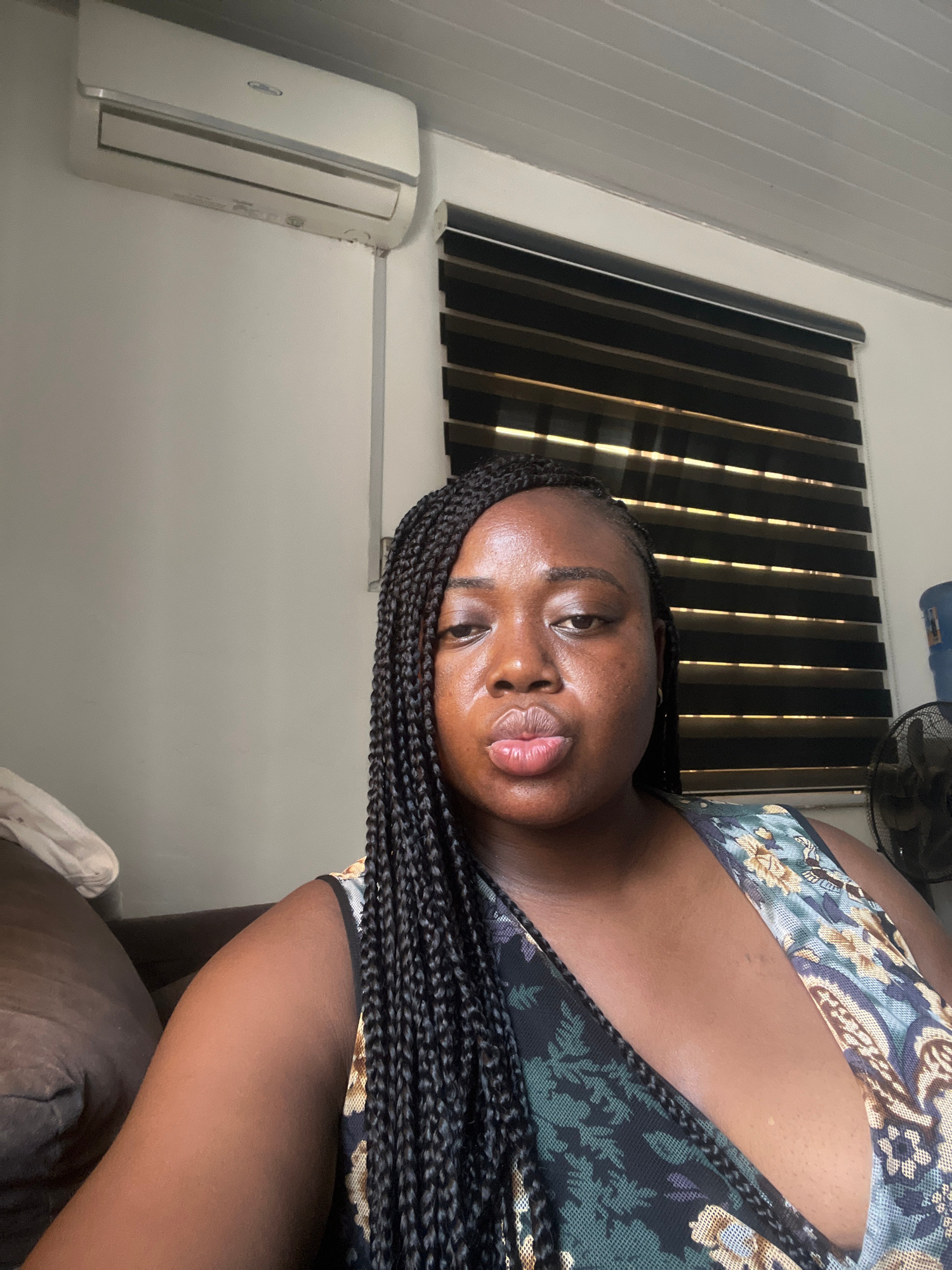 A young Black woman is prominently featured in a close-up, indoor portrait. She is positioned with her head slightly tilted, looking directly at the camera with a neutral, contemplative expression. He…read more