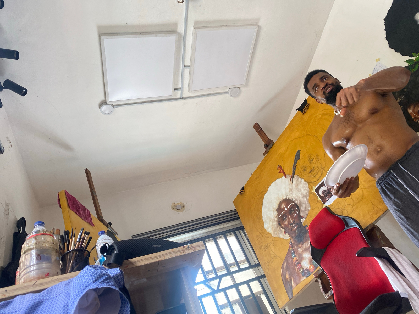 The image shows a room in Ado, Nigeria, presumably an artist's studio. A shirtless Black man with a beard is holding a white plate and a small photo in front of a large painting on an easel. The paint…read more