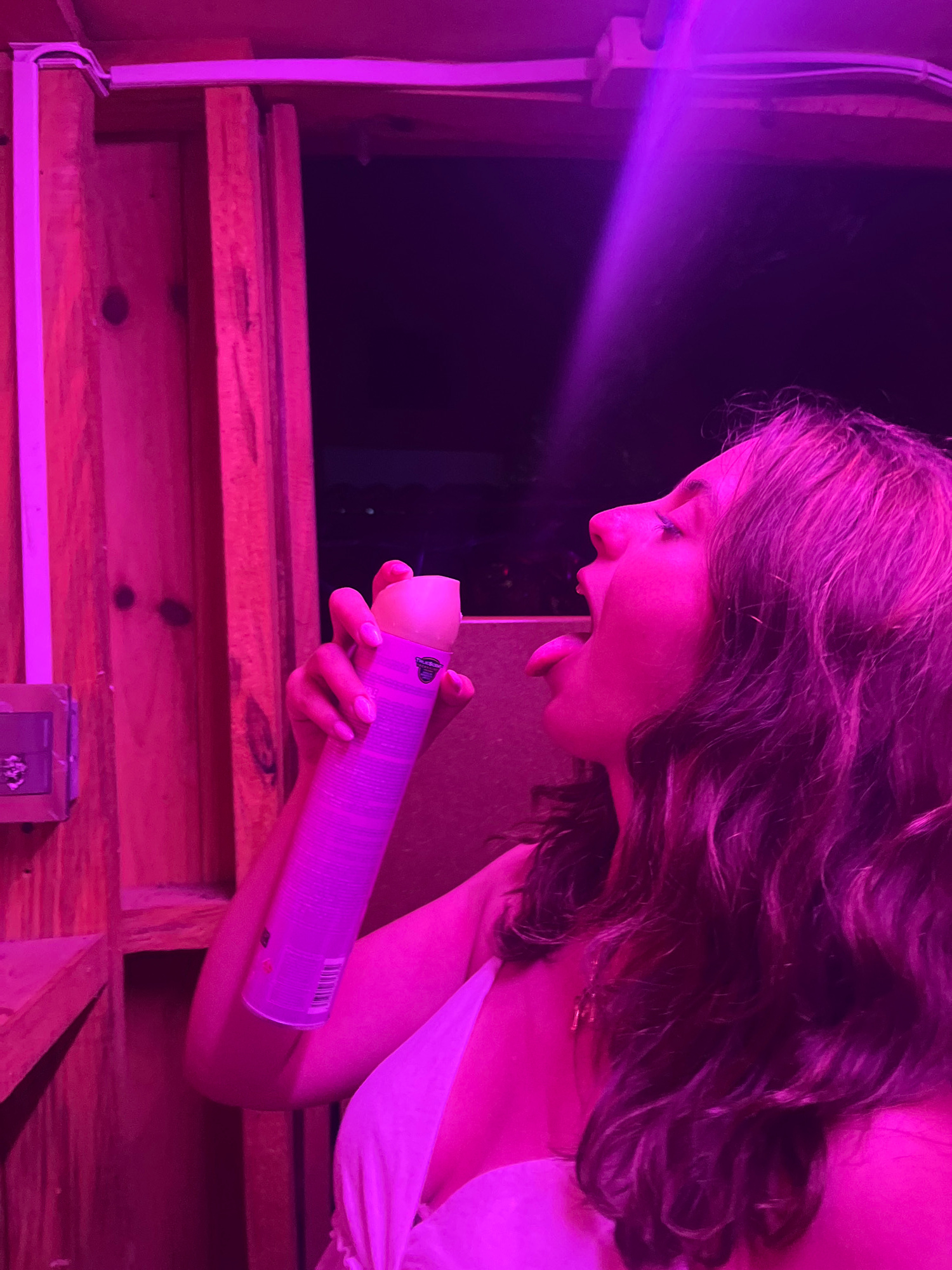 A woman with wavy brown hair is positioned in what appears to be a wooden structure, possibly a porch or loft. She is leaning forward, her mouth open with her tongue protruding slightly, and holding a…read more