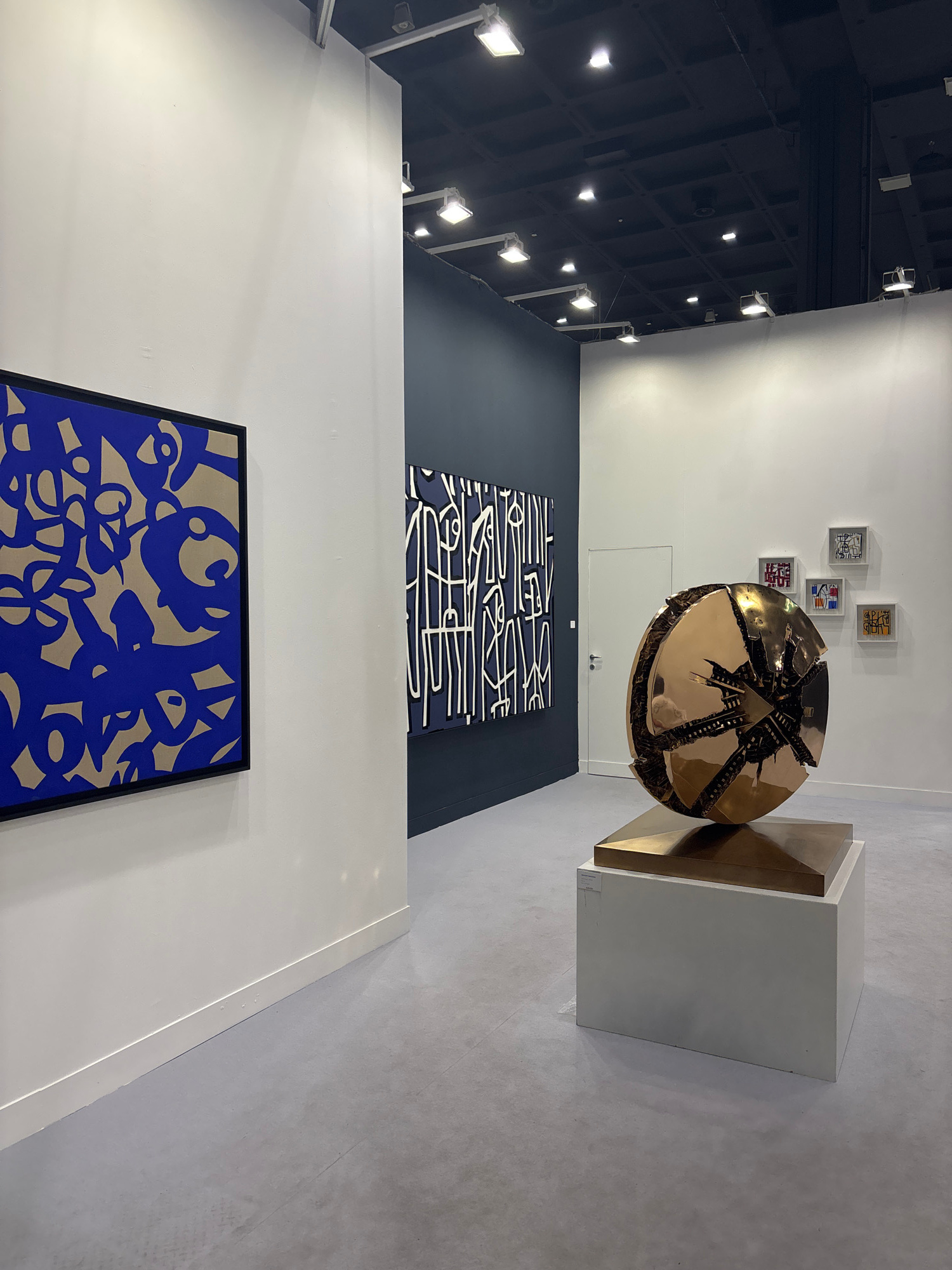This image captures an interior view of an art gallery or exhibition space, likely in Milan, Italy, showcasing various modern artworks under artificial lighting. In the mid-ground, a striking, large,…read more