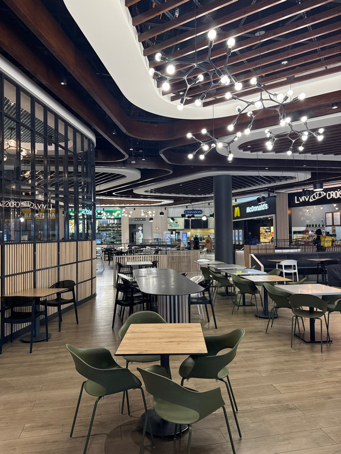 This image depicts the interior of a large, modern food court, identified as being within the Blockbuster Mall in Kyiv, Ukraine. The high ceiling features a complex design with dark wooden slat panels…read more