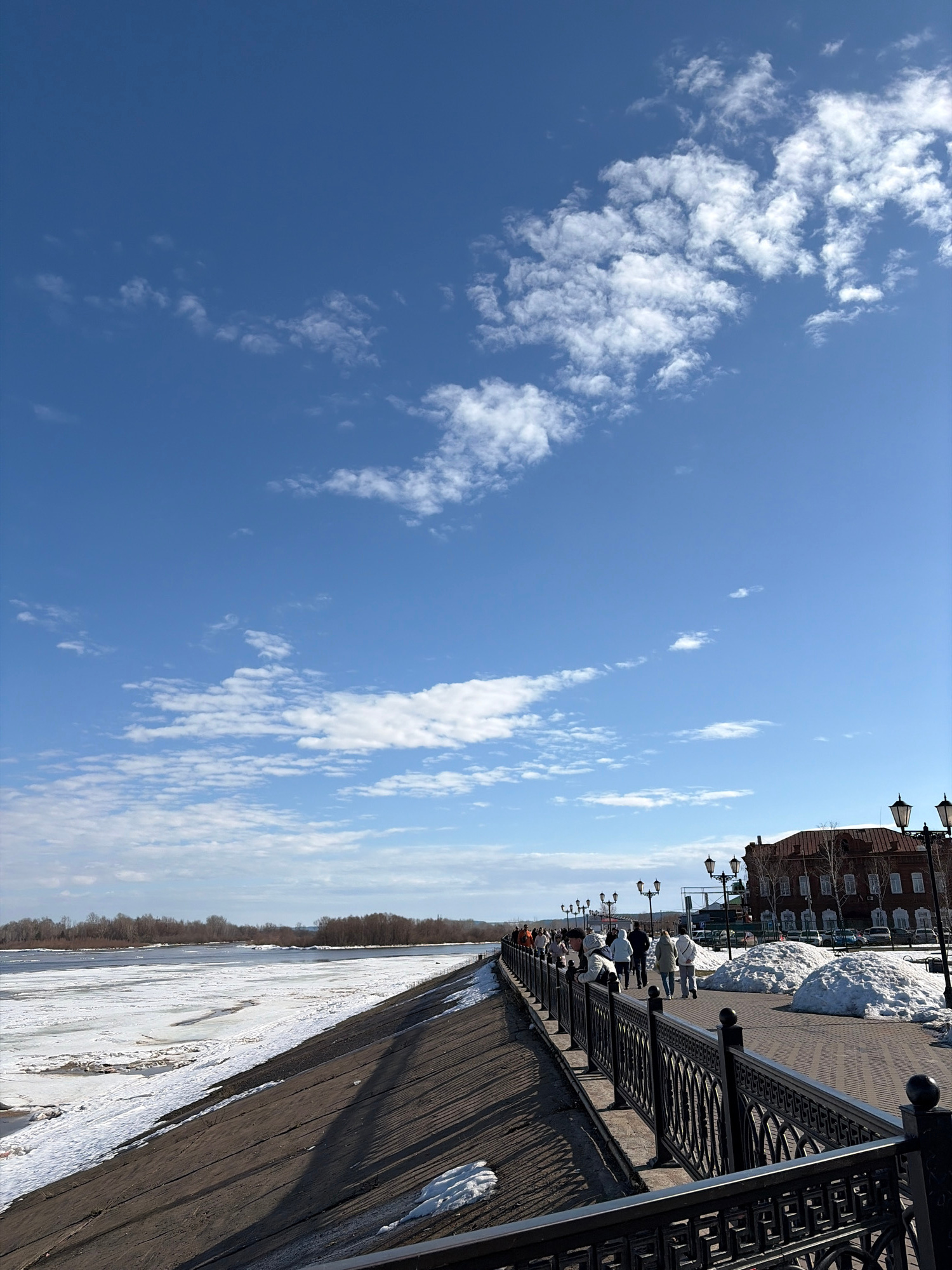 The image depicts a view from the embankment in Sarapul, Russia, overlooking the Kama River. The river is partially frozen and covered with snow. The embankment features a wrought iron railing, a pave…read more
