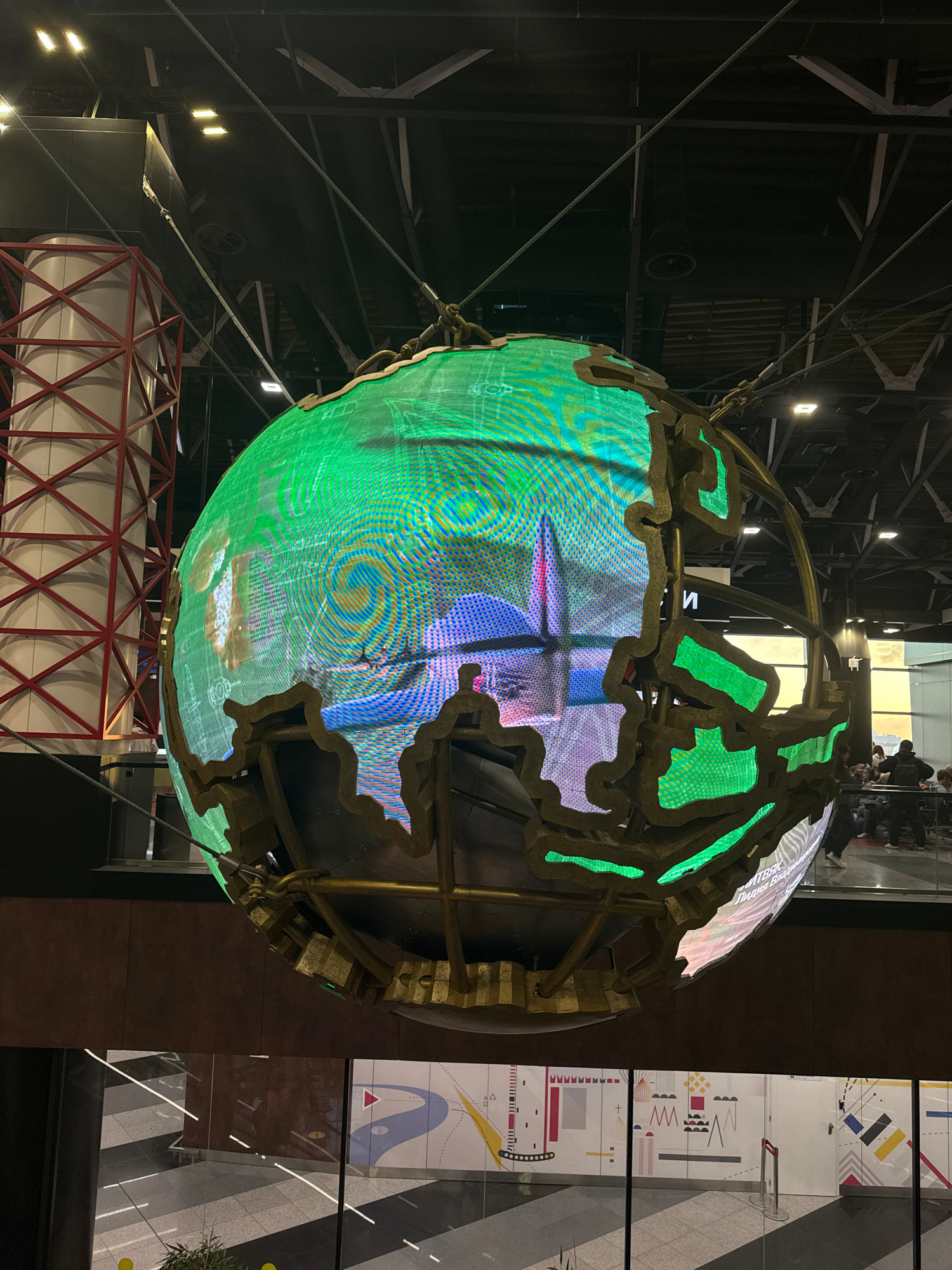 A large, illuminated spherical display, resembling a globe, dominates the center of the image. Its structure features a dark, solid core encased in a golden or bronze skeletal frame that outlines geog…read more