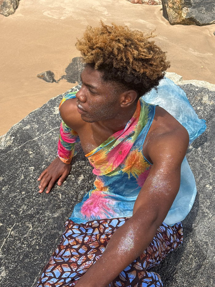 A male individual with dark skin and short, bleached blonde-brown curly hair is positioned on a large, dark, textured rock at a beach in Alaguntan, Nigeria. He is seated, looking towards the left side of the frame with his head slightly tilted. His face and exposed arms are speckled with reflective glitter or shimmering particles. He wears a sheer, multi-colored garment featuring a tie-dye or abstract pattern in shades of blue, pink, orange, and yellow, with one long sleeve covering his left arm and the fabric draped across his torso. Below, he wears lower attire with a brown and blue geometric pattern. A light blue, translucent fabric or object is visible behind and to his right, resting on the rock. The immediate background consists of light brown sand with additional dark rocks, indicating a coastal environment under bright sunlight. | Open Wire