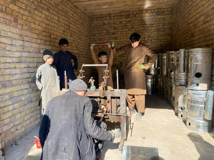 The scene depicts an indoor workshop in Kandahar, Afghanistan, featuring light brown brick walls and a concrete floor illuminated by natural light entering from the right. Five males are present. In the foreground, an adult male, viewed from behind, wears a dark jacket and a grey knit cap while seated or crouched, manipulating a component of a large, manually operated metal press machine. A young male, wearing a light brown tunic, actively operates the machine by pulling down a lever. To his right, an older adolescent or adult male, also in a light brown tunic and green gloves, stands with his left hand on his hip, observing the operation. To the left, two adolescent males stand: one in a light grey tunic and matching knit cap, with hands in pockets, and another in a dark tunic. The right side of the workshop is filled with stacks of cylindrical, galvanized metal stoves or heaters, indicating the manufactured product. A small red object is visible on the floor in the left foreground. | Open Wire