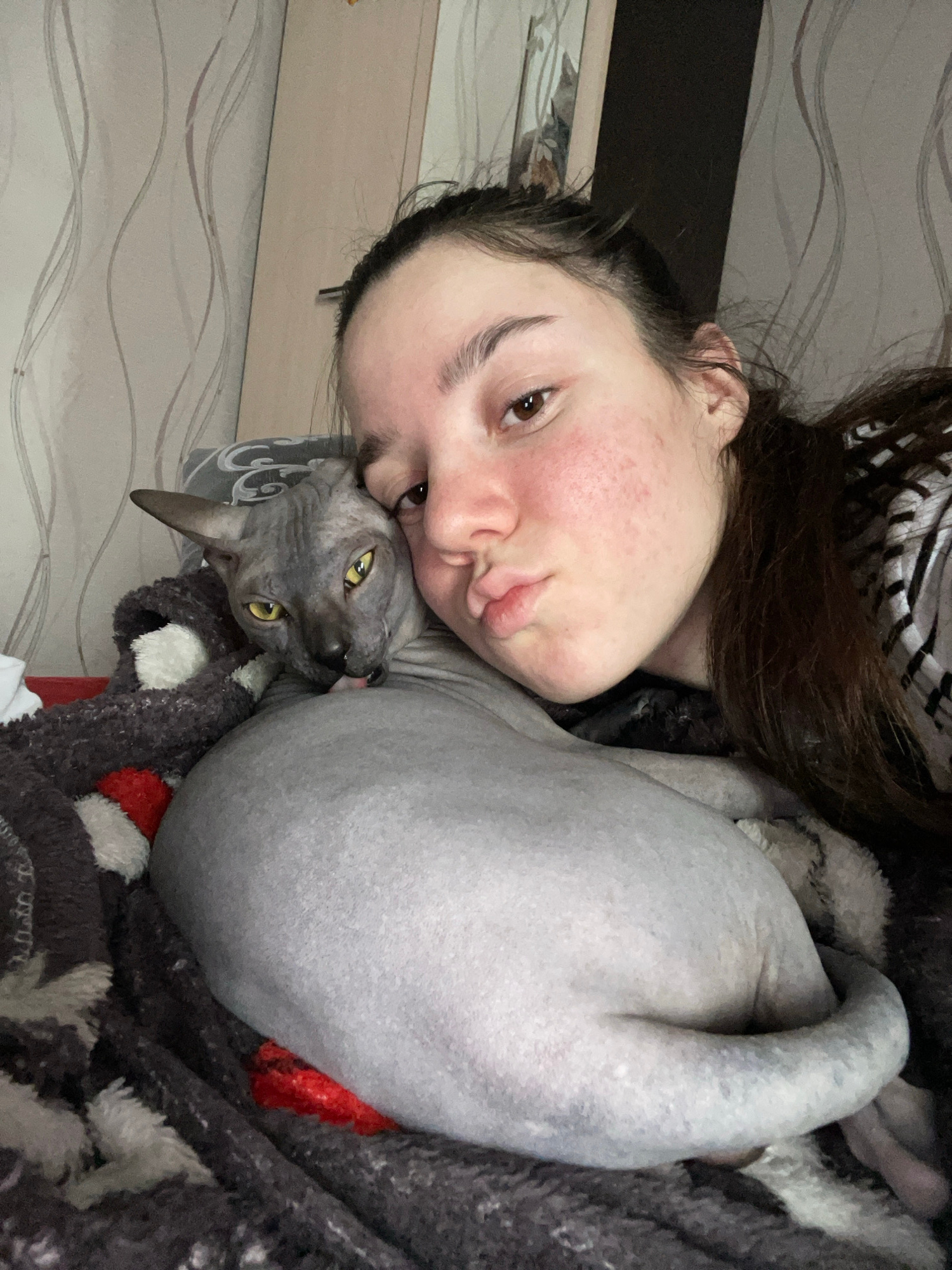 A young woman is lying down next to a gray Sphynx cat. The woman is fair-skinned with brown hair, and she is looking at the camera with slightly pursed lips. Her face is close to the cat's head. The c…read more