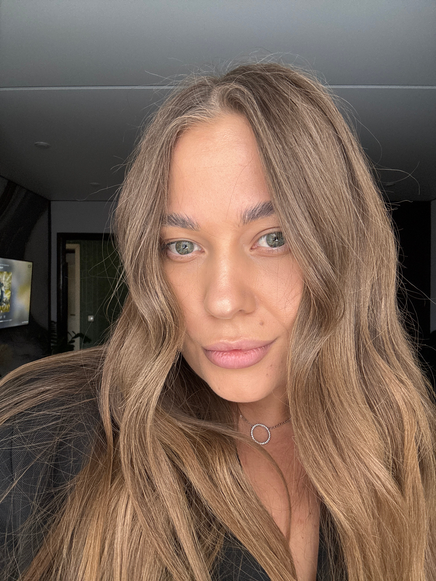 A young woman with long blonde hair is facing the camera. She is wearing a simple circular pendant necklace. The background includes a gray wall and a window or picture frame. The location is not evid…read more