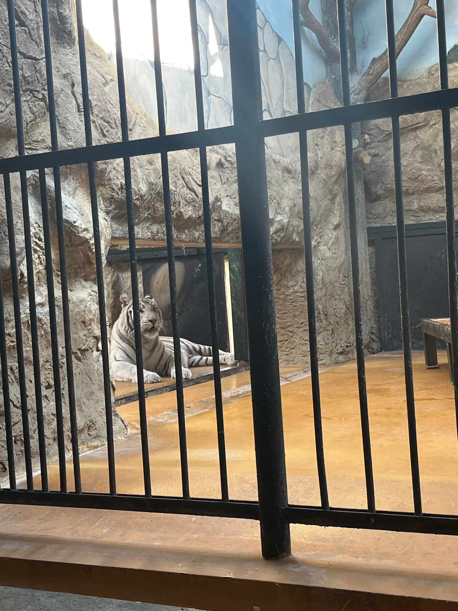 A medium shot shows a white tiger behind a black metal cage. The tiger is lying down on a rocky surface that appears to be part of its enclosure. The enclosure has artificial rock walls and a yellow-p…read more