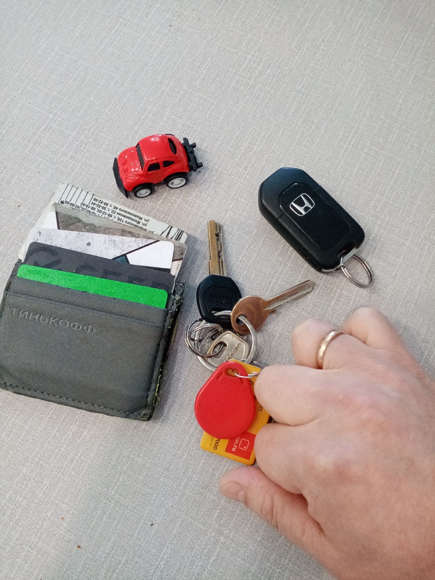 The image shows a flat lay on a light gray textured surface, possibly a tablecloth or table. Items include a gray leather cardholder with the Cyrillic word "ТИНЬКОФФ" (Tinkoff) printed on it. The card…read more
