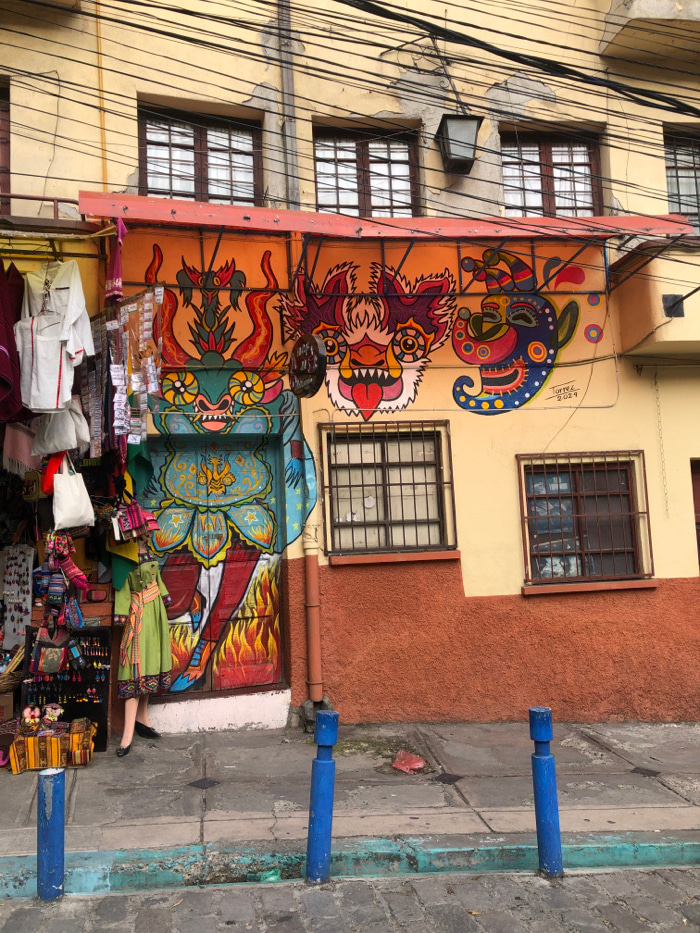 A vibrant mural decorates the side of a building, featuring colorful, stylized creatures. Below the mural, a street vendor displays various textiles and handicrafts, filling the sidewalk with merchand…read more