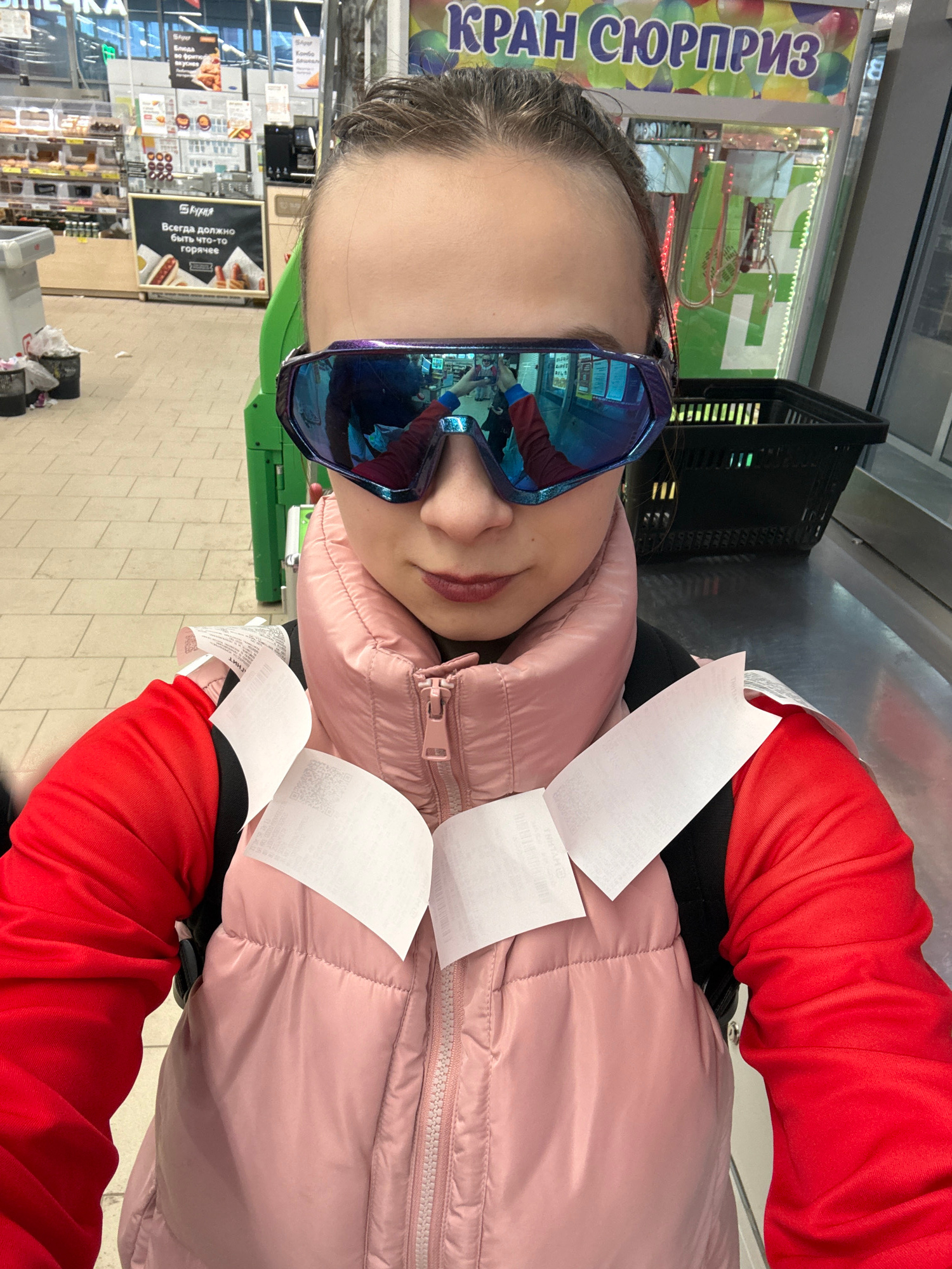 A person wearing blue mirrored sunglasses, a pink puffer jacket, and a red top is standing at a checkout counter in a store. The person is covered in multiple white receipts. The scene includes a blac…read more