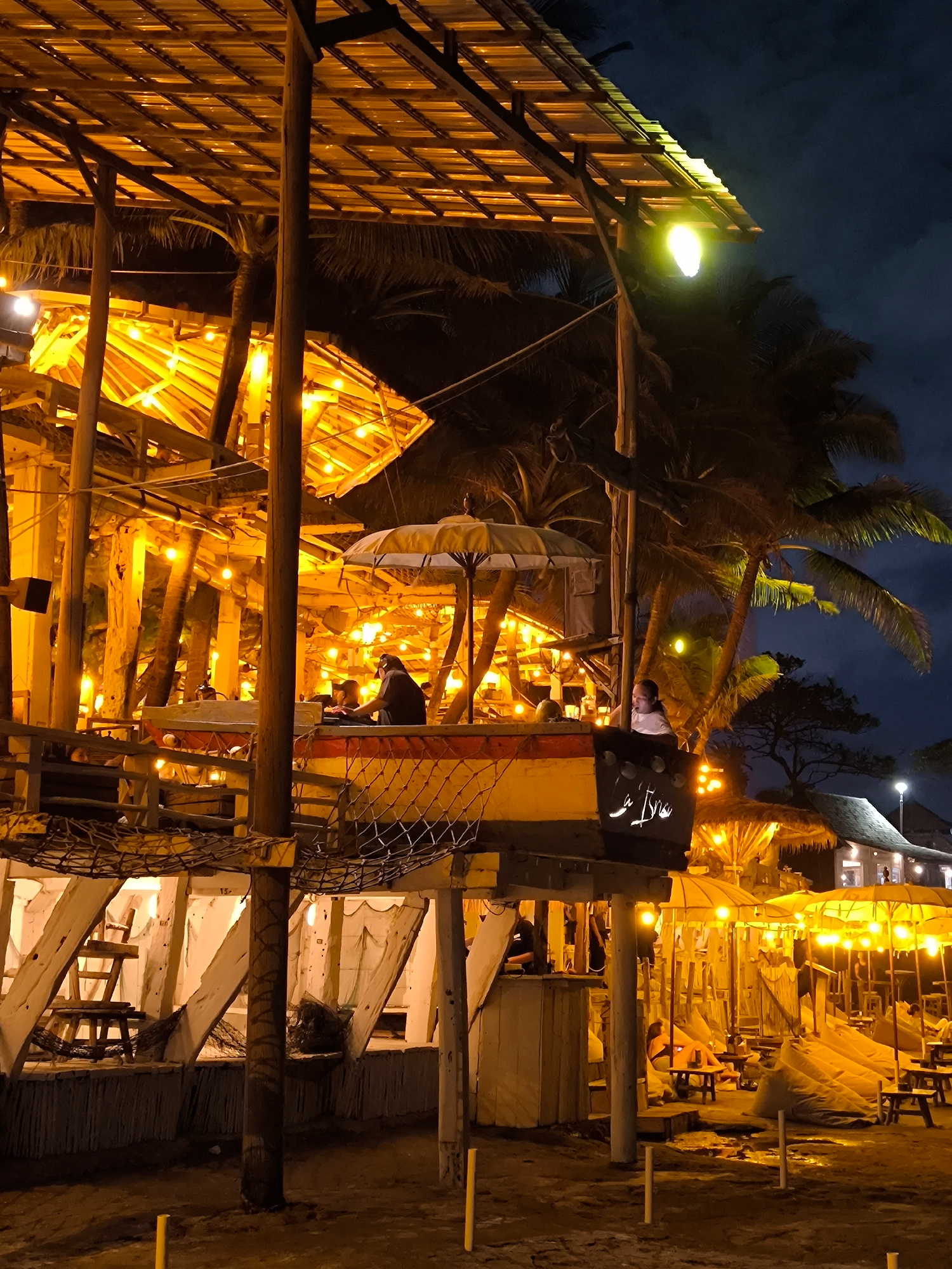 The image depicts a dimly lit outdoor dining area at night, potentially located in Canggu, Indonesia, based on the architectural style and atmosphere. The scene is dominated by a multi-level wooden st…read more