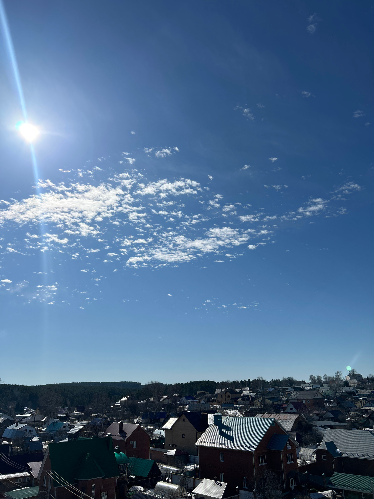 The image depicts a view over the city of Chaikovsky, Russia, under a bright blue sky with scattered altocumulus clouds. The sun shines brightly, creating a lens flare at the bottom left of the frame.…read more