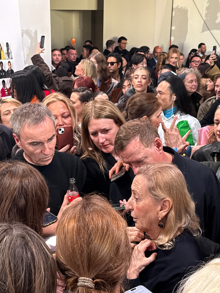 This image depicts a densely crowded indoor scene, characteristic of a fashion event or presentation, likely in Milan, Italy. The environment features plain, light-colored walls, with fashion-relatedβ¦read more