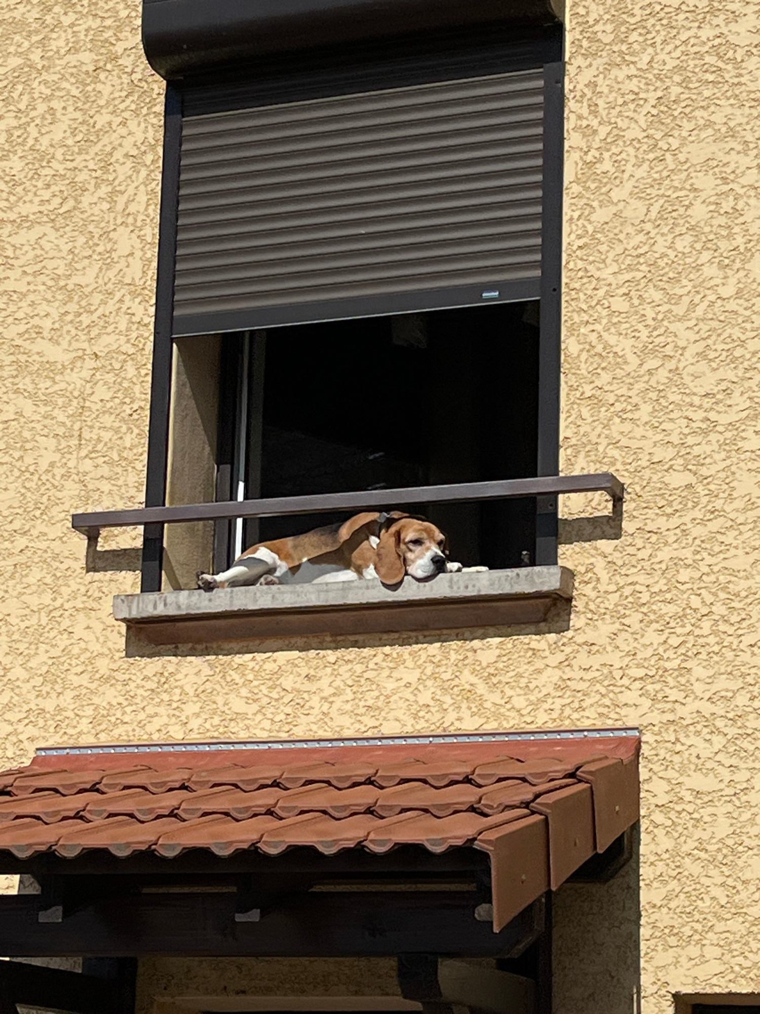A tan and white beagle is wedged in a partially open window on a building. The building's exterior is textured and painted a light yellow color. The window frame is dark gray, and the partially open s…read more