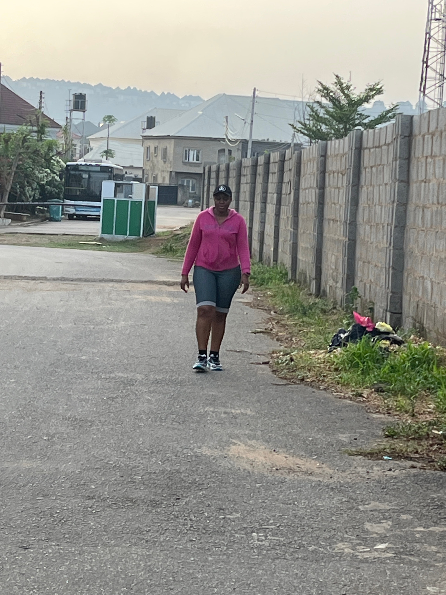 A woman in a pink long-sleeved shirt, gray shorts, a black hat, and black and white athletic shoes is standing on a gray asphalt road. The road is lined on the left with a concrete block wall and on t…read more