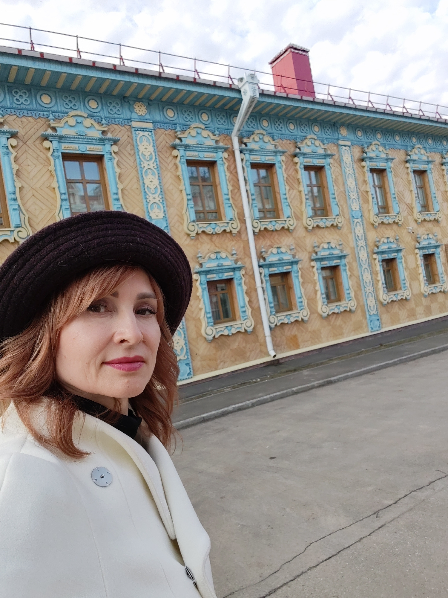 A woman in a brown hat and white coat stands in front of a building with ornate, traditional Russian architectural details. The building has a tan facade with numerous windows framed in light blue, deβ¦read more