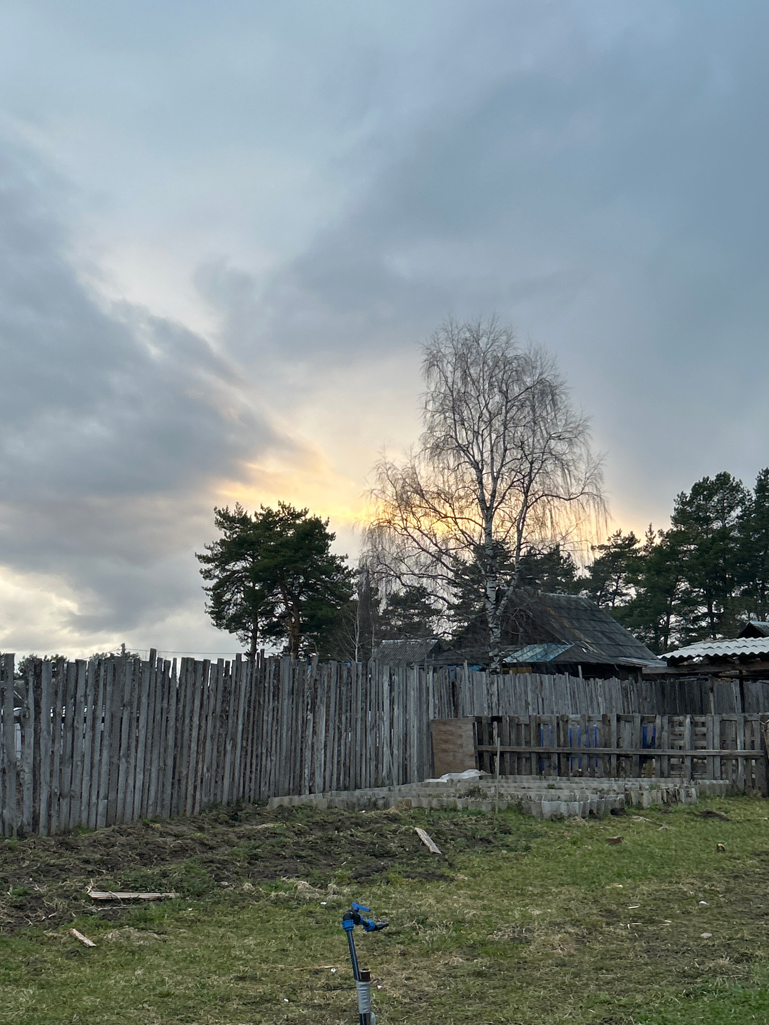 This image depicts a rural or semi-rural scene in Rusalevka, Russia, likely during late afternoon or early morning given the light. The sky is largely overcast with prominent grey clouds, but a bright…read more