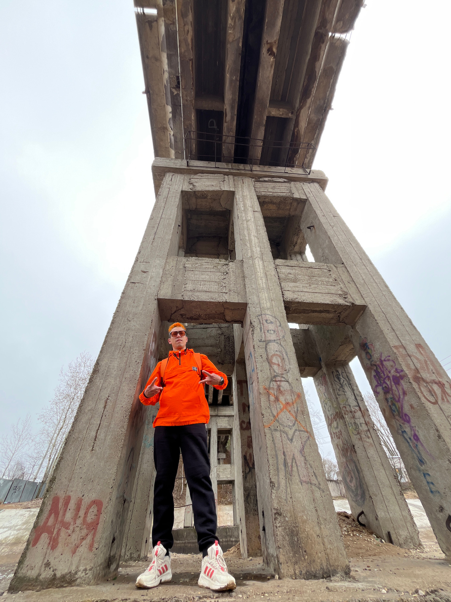An individual stands on a large, weathered concrete beam, part of an extensive, possibly abandoned, concrete structure. The image, taken outdoors on an overcast day, shows a male with vibrant orange h…read more